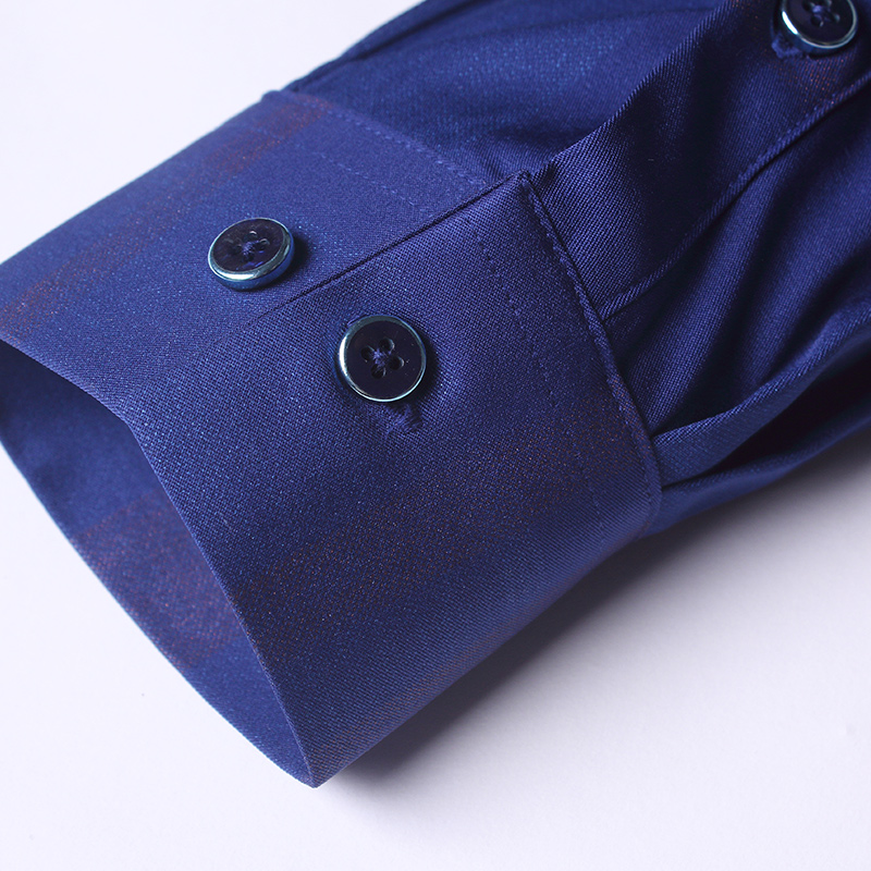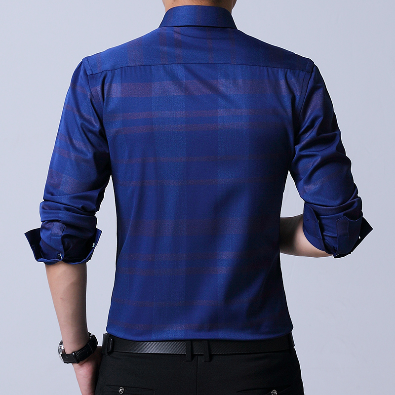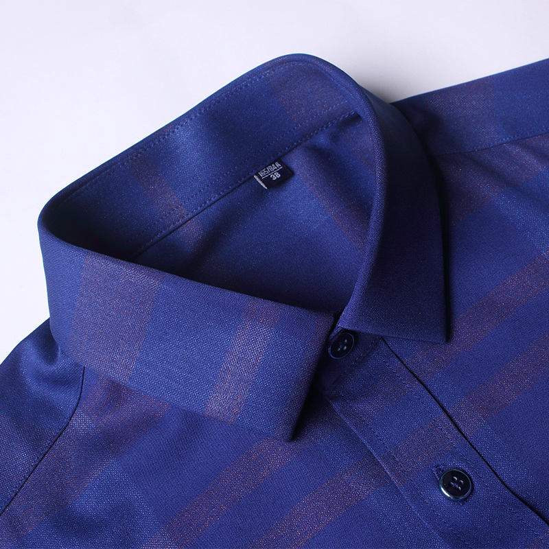 / 秋季男士長袖襯衫休閑免燙暗花紋印花彈力中年純色修身格子襯衣男