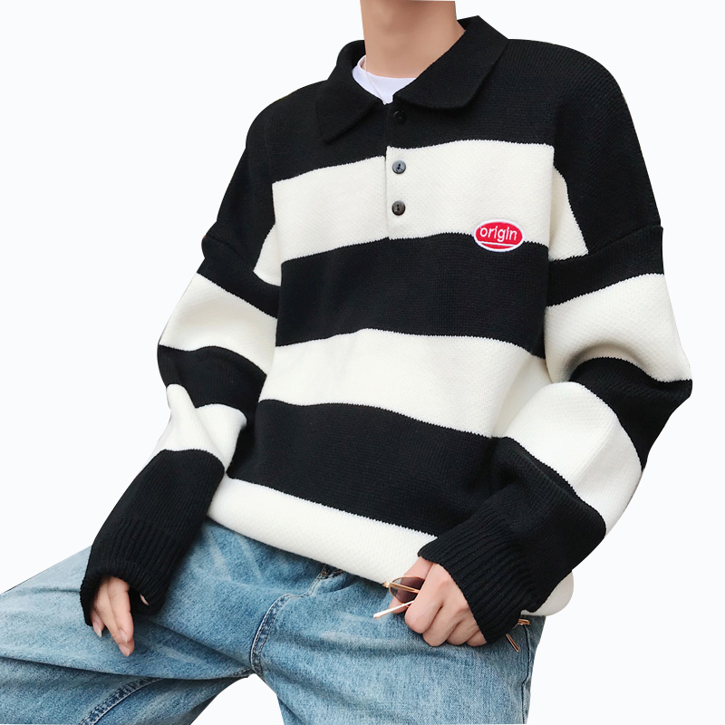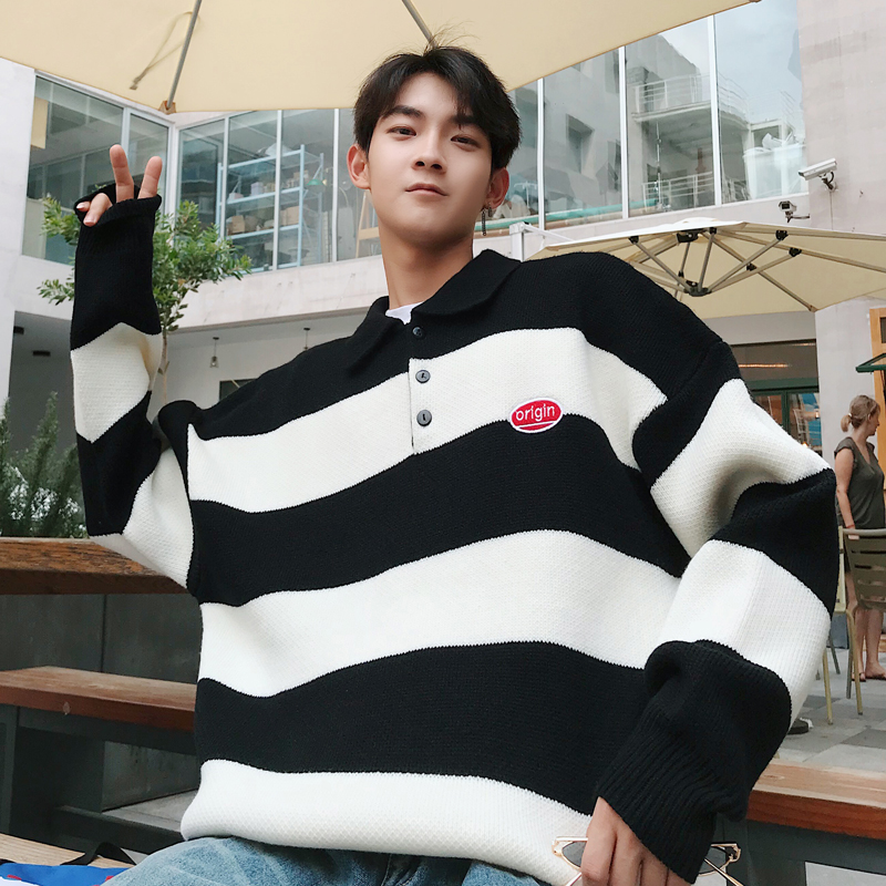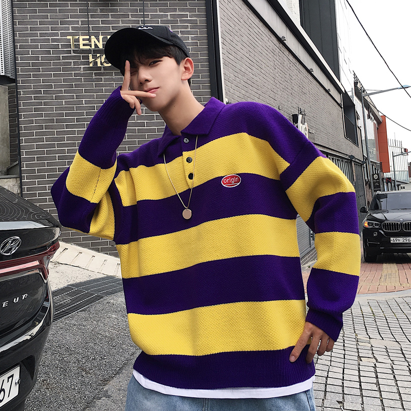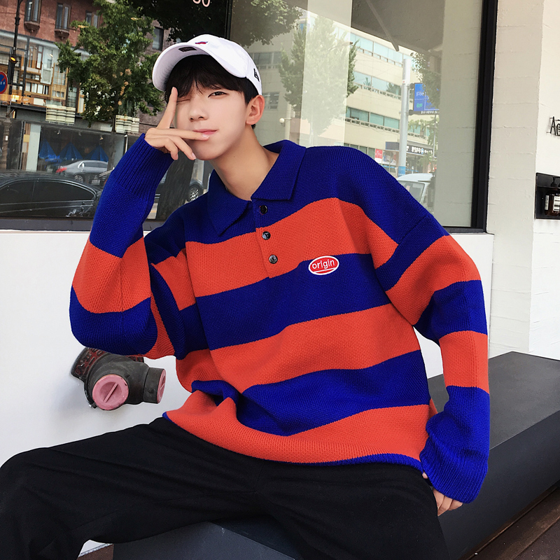 文藝男女店針織衫ins港風秋季polo套頭毛衣男條紋翻領上衣男秋裝