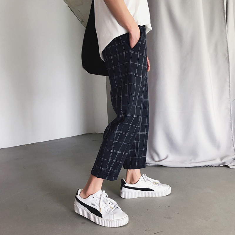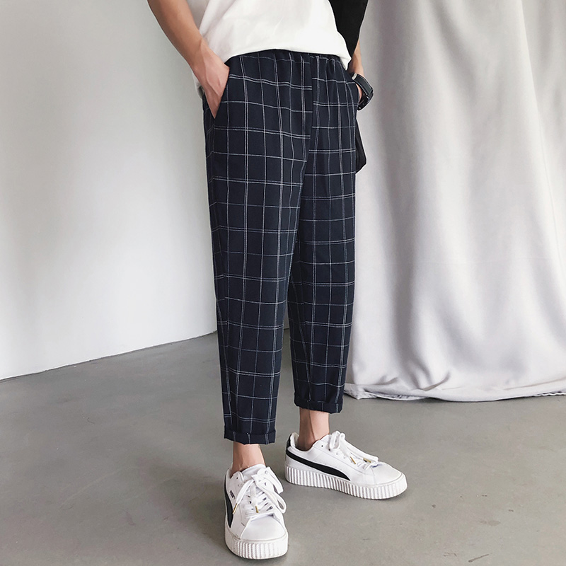 / 秋季韓版潮流休閑褲男士格子薄款褲修身小腳褲九分褲原宿風褲子男