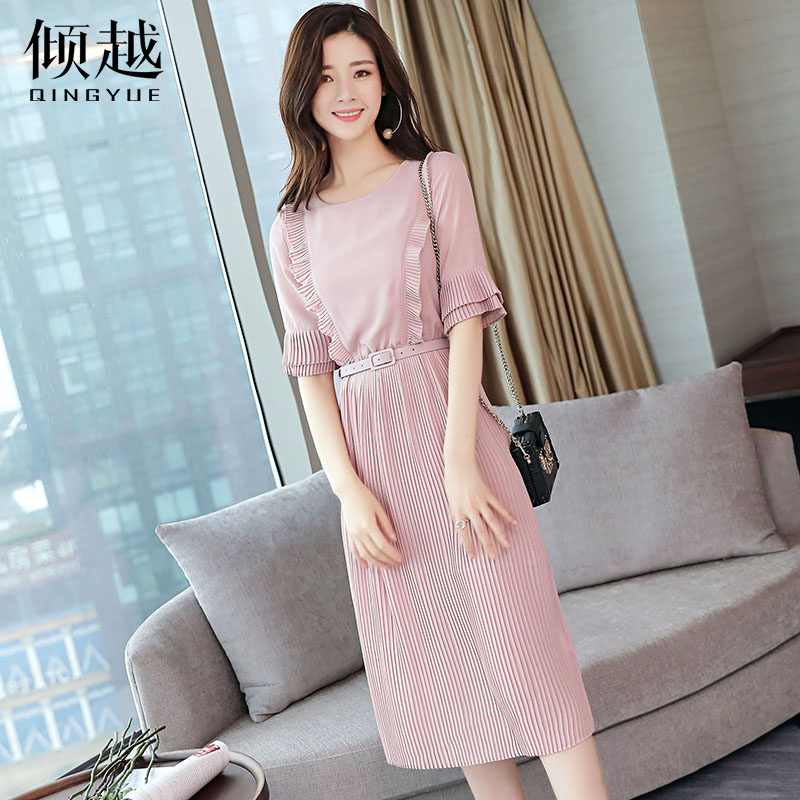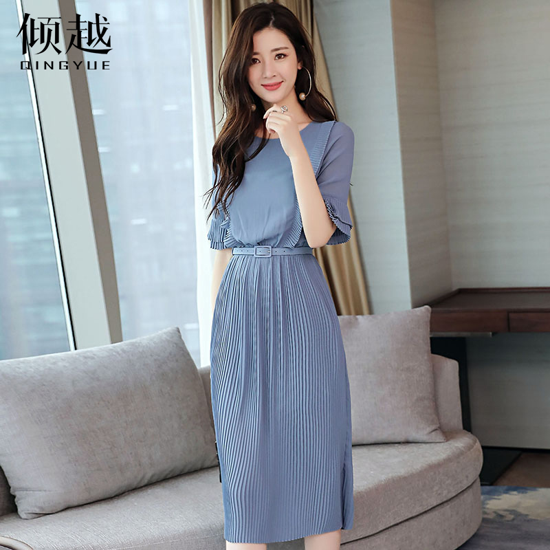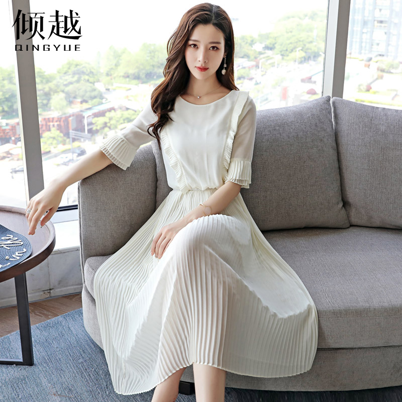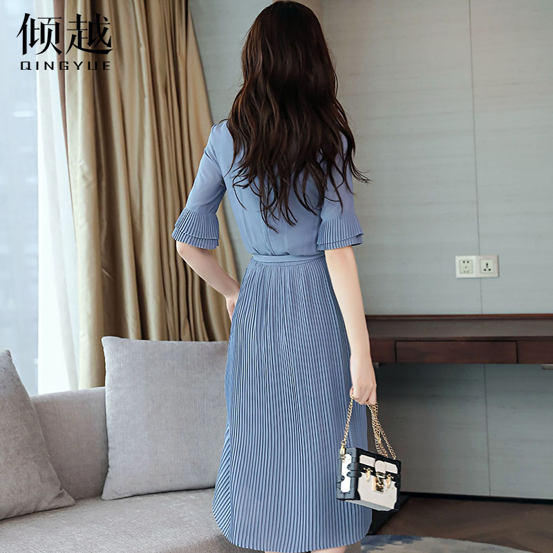 雪紡連衣裙女夏2017新款長裙韓版百褶裙子修身顯瘦喇叭袖氣質淑女