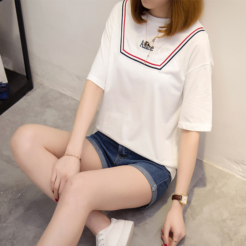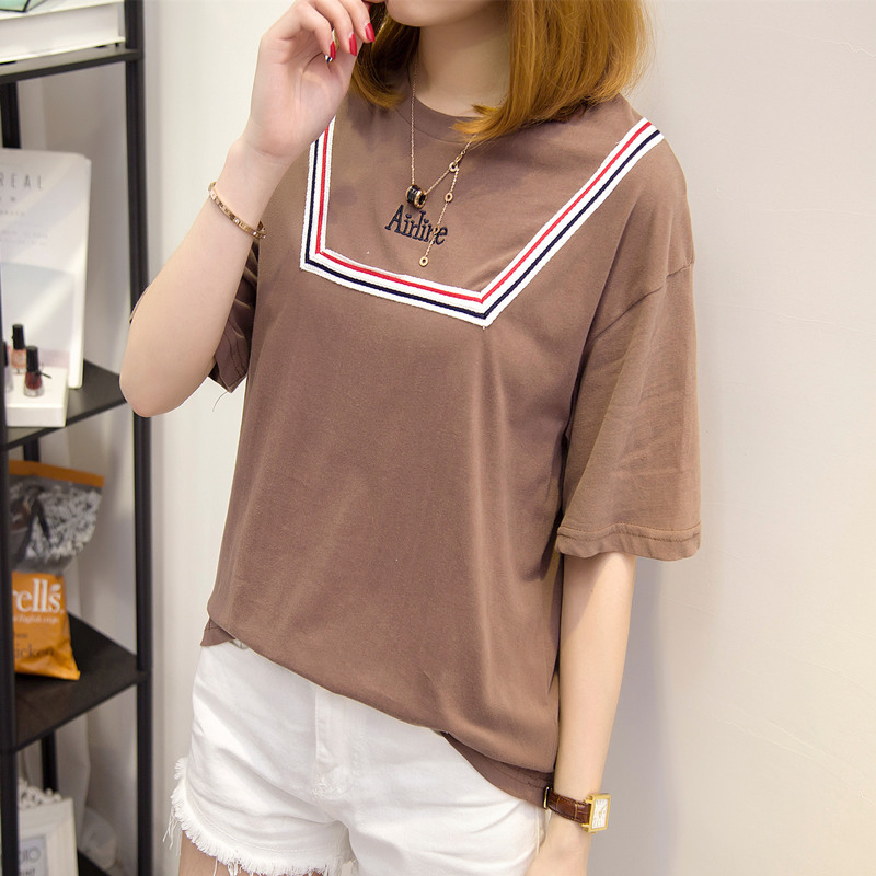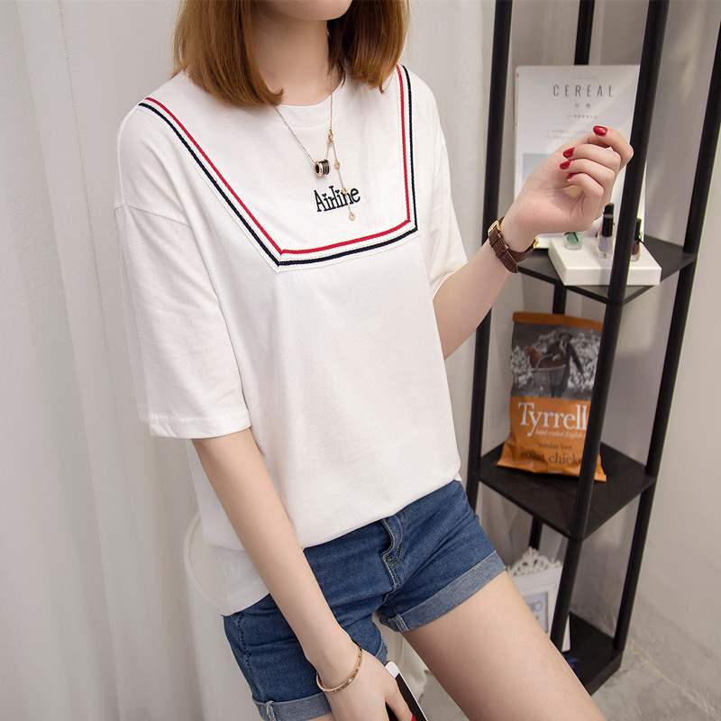 寬松t恤女白色短袖上衣女夏新款潮打底體恤衫韓版條紋百搭