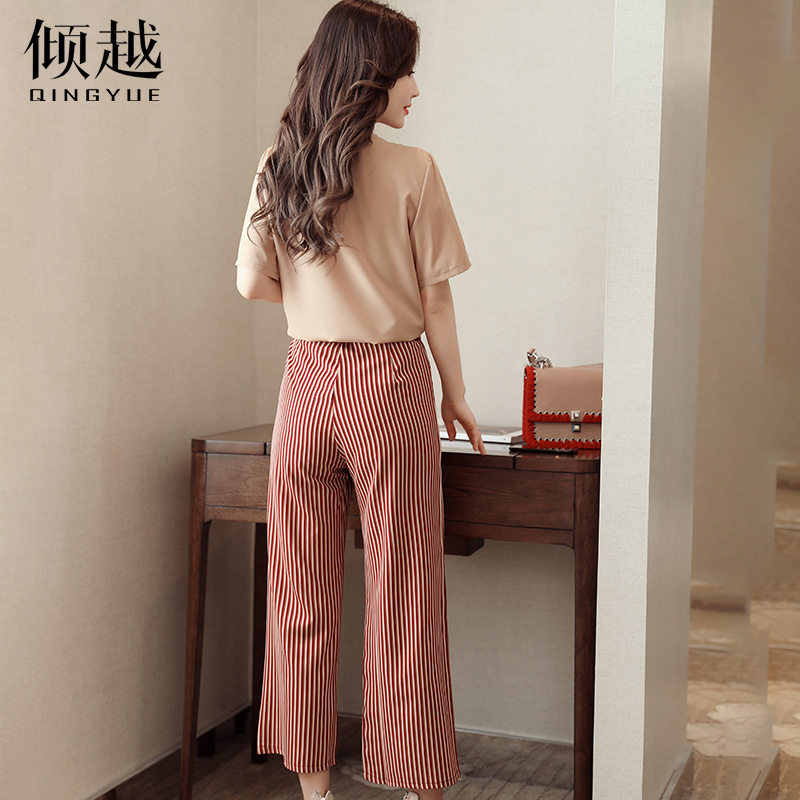 / 條紋雪紡闊腿褲套裝高腰裙褲2017女夏季寬松九分褲時尚兩件套褲裙