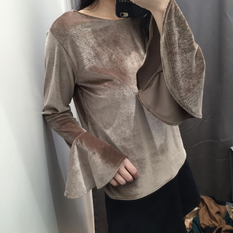/ 秋款韓國chic純色百搭寬松顯瘦喇叭袖圓領套頭長袖上衣T恤女