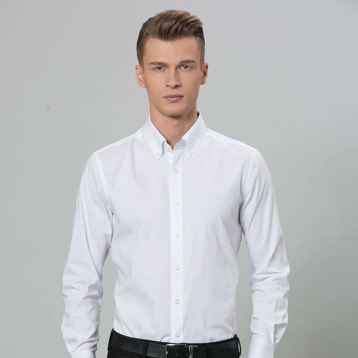 / 秋季精紡牛津紡男士長袖白襯衫釘扣領韓版修身型貼身純棉男裝襯衣