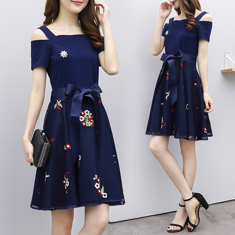 一字領繡花連衣裙