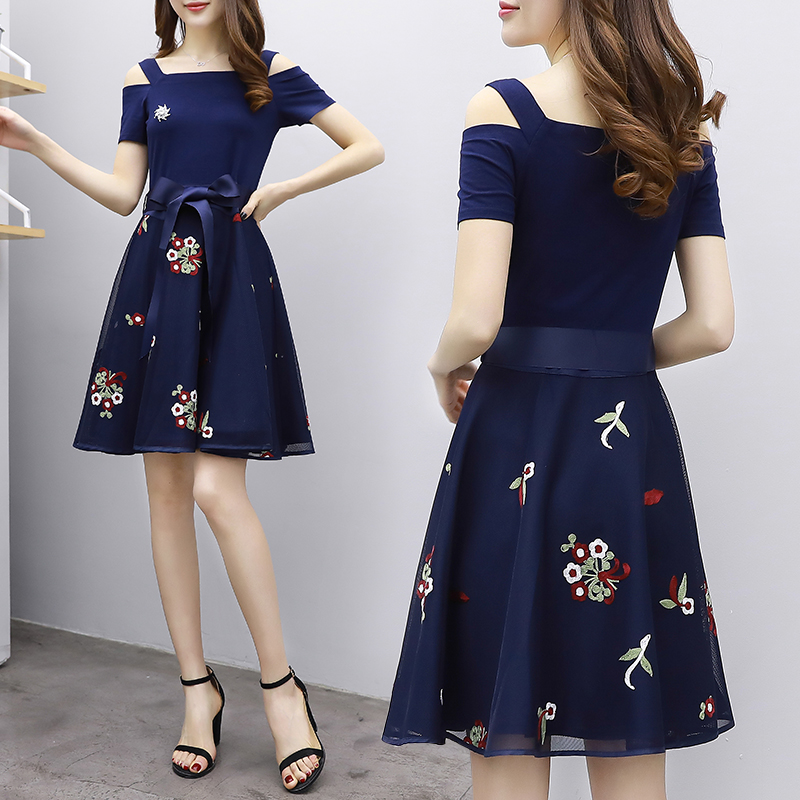 / 短袖露肩網紗針織連衣裙2017夏季女士韓版一字領繡花中長裙A字裙