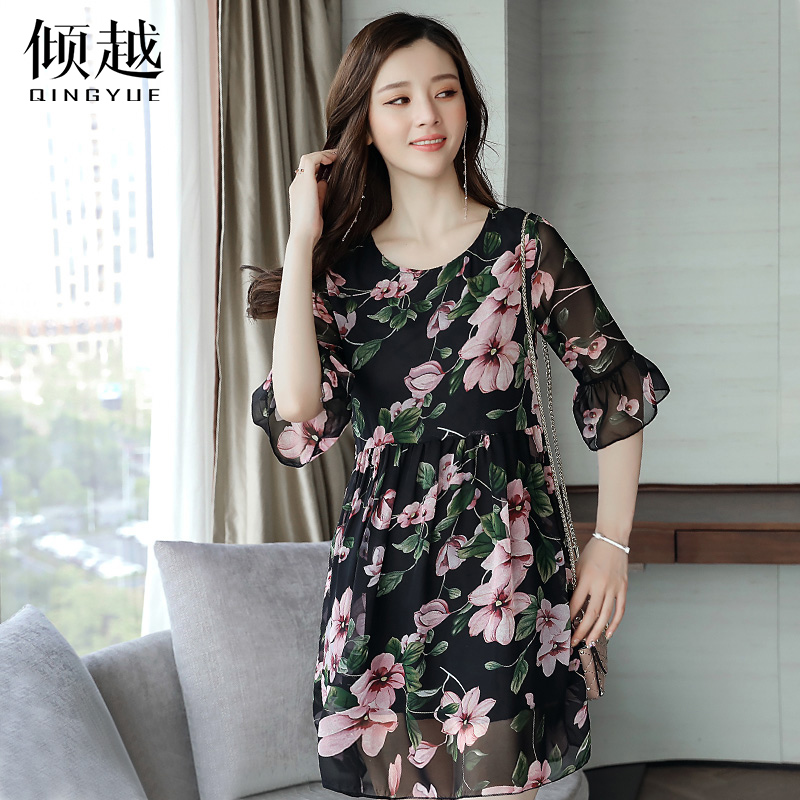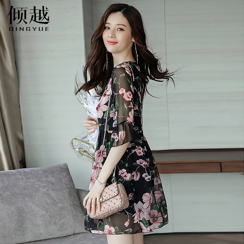 2017夏裝新款女裝時尚韓版寬松裙子圓領荷葉袖印花雪紡連衣裙女潮