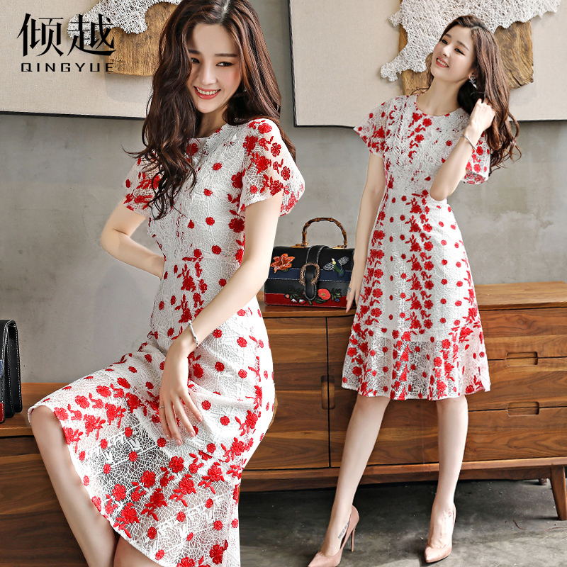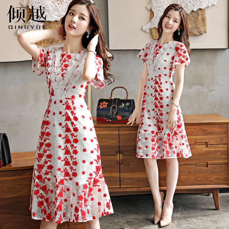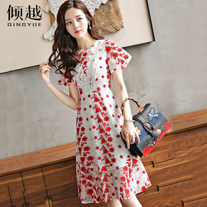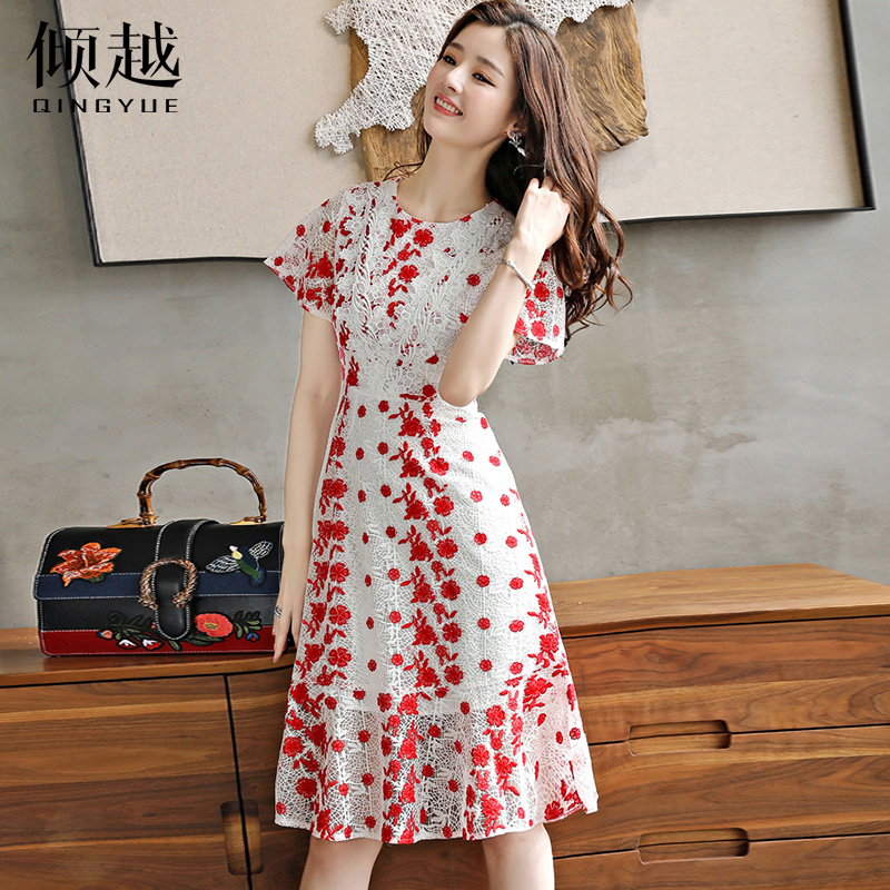 / 2017女裝新款名媛氣質修身收腰顯瘦重工刺繡水溶鏤空蕾絲連衣裙夏