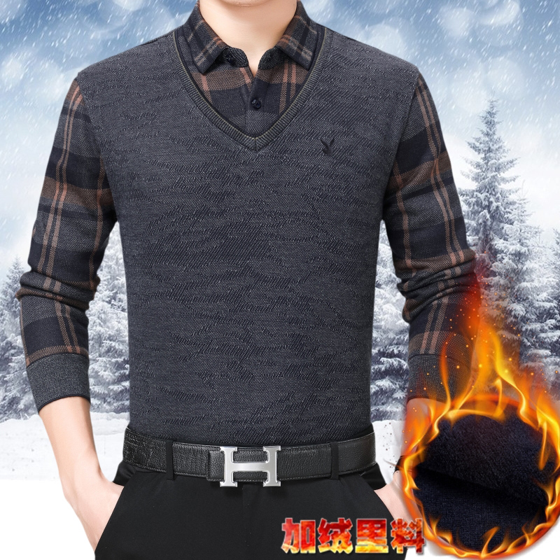 花花公子正品中年男士長袖保暖襯衫商務男裝假兩件加絨加厚襯衣冬