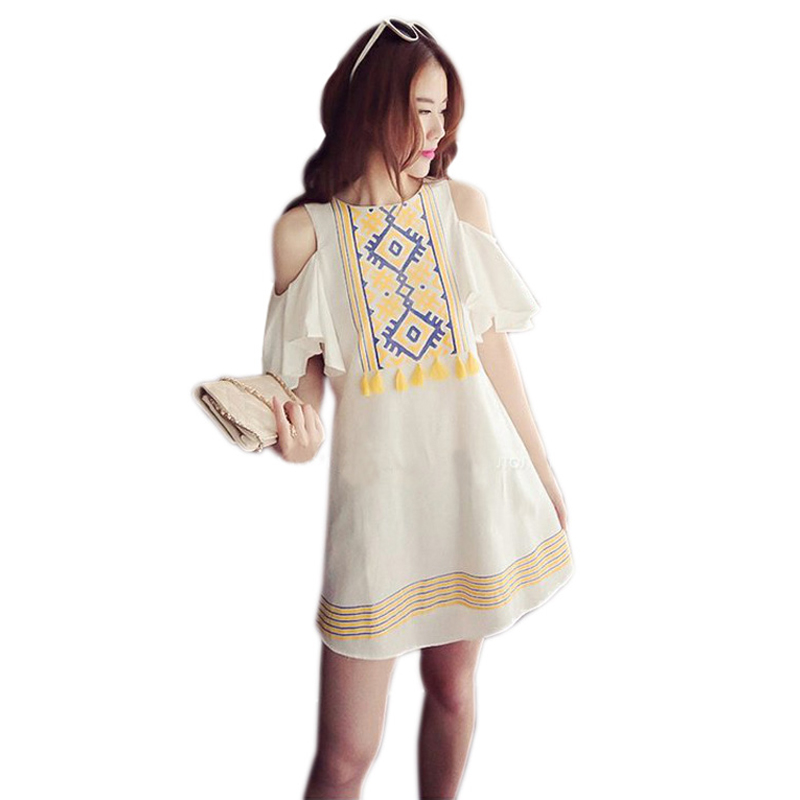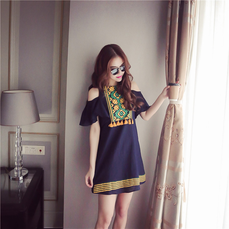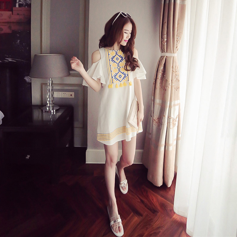 夏季韓版棉麻露肩連衣裙顯瘦時尚印花荷葉袖短裙海邊度假裙沙灘裙