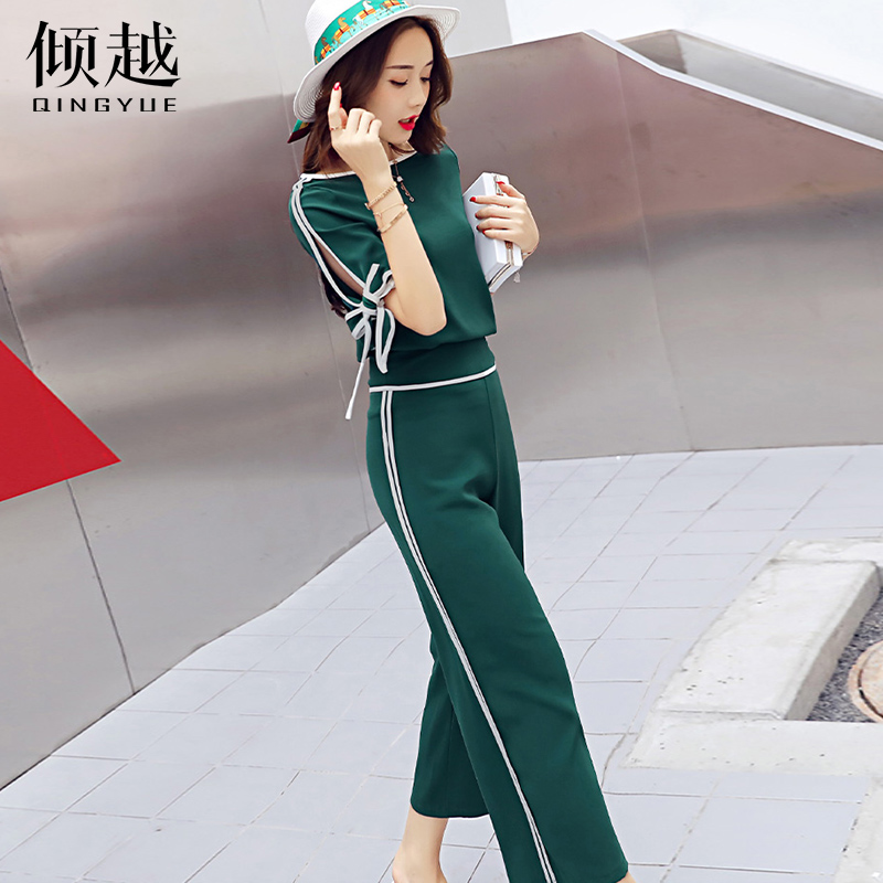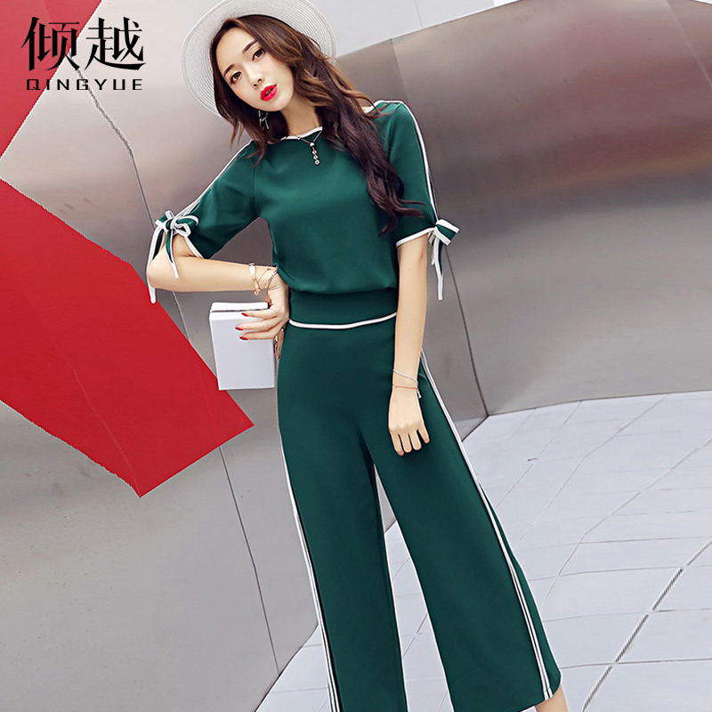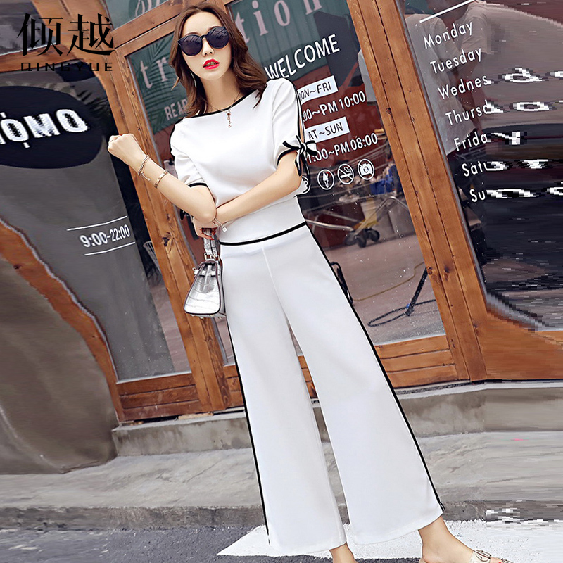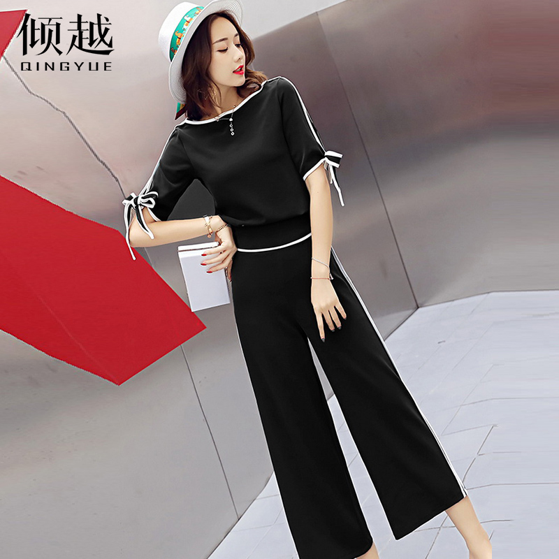 時尚套裝女2017夏季新款九分闊腿褲高腰短袖潮韓版休閑氣質兩件套