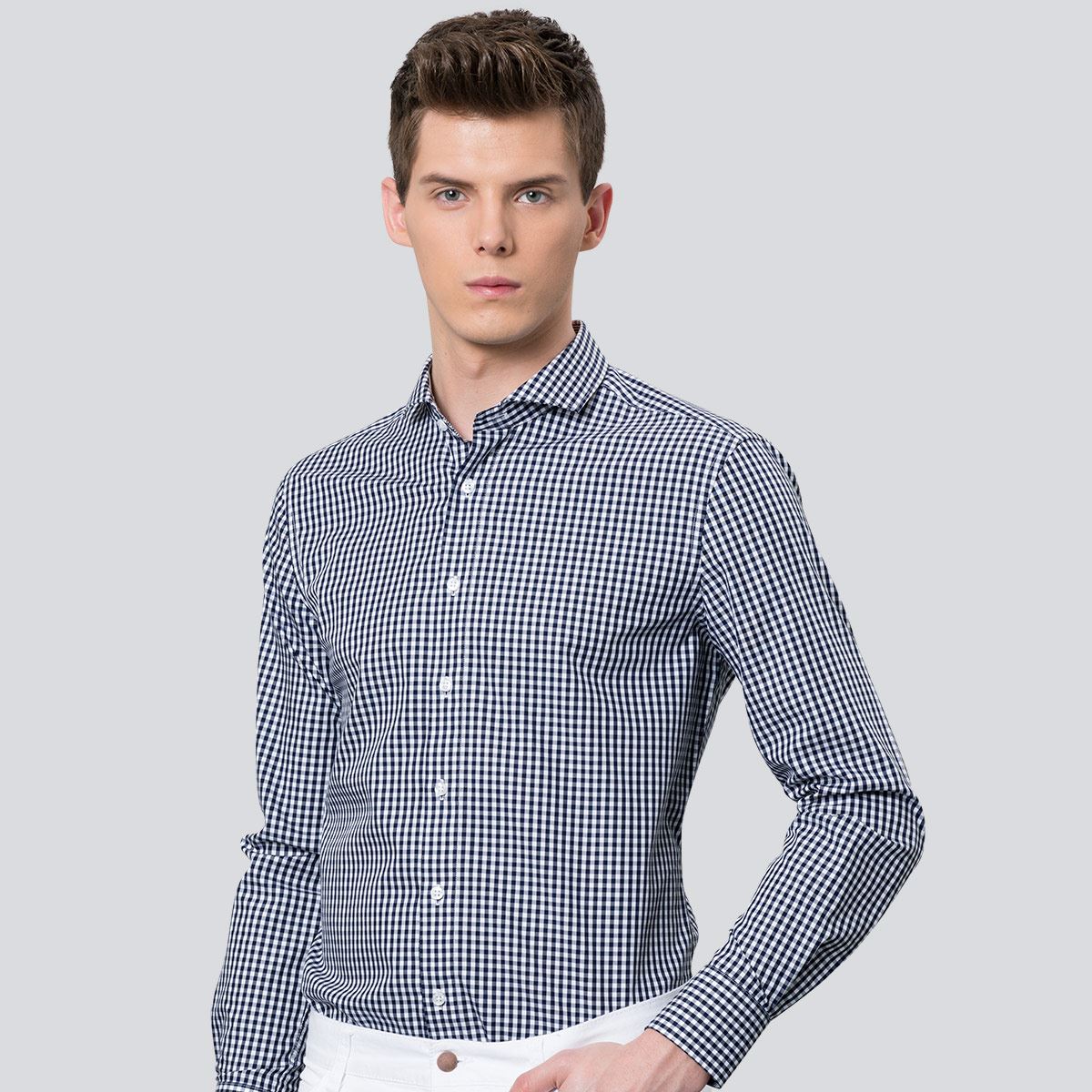 深海藍白小格子襯衫長袖男士休閑黑白色格子襯衣韓版修身純棉免燙