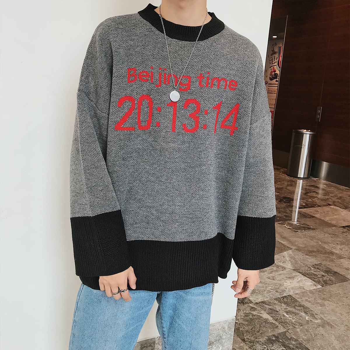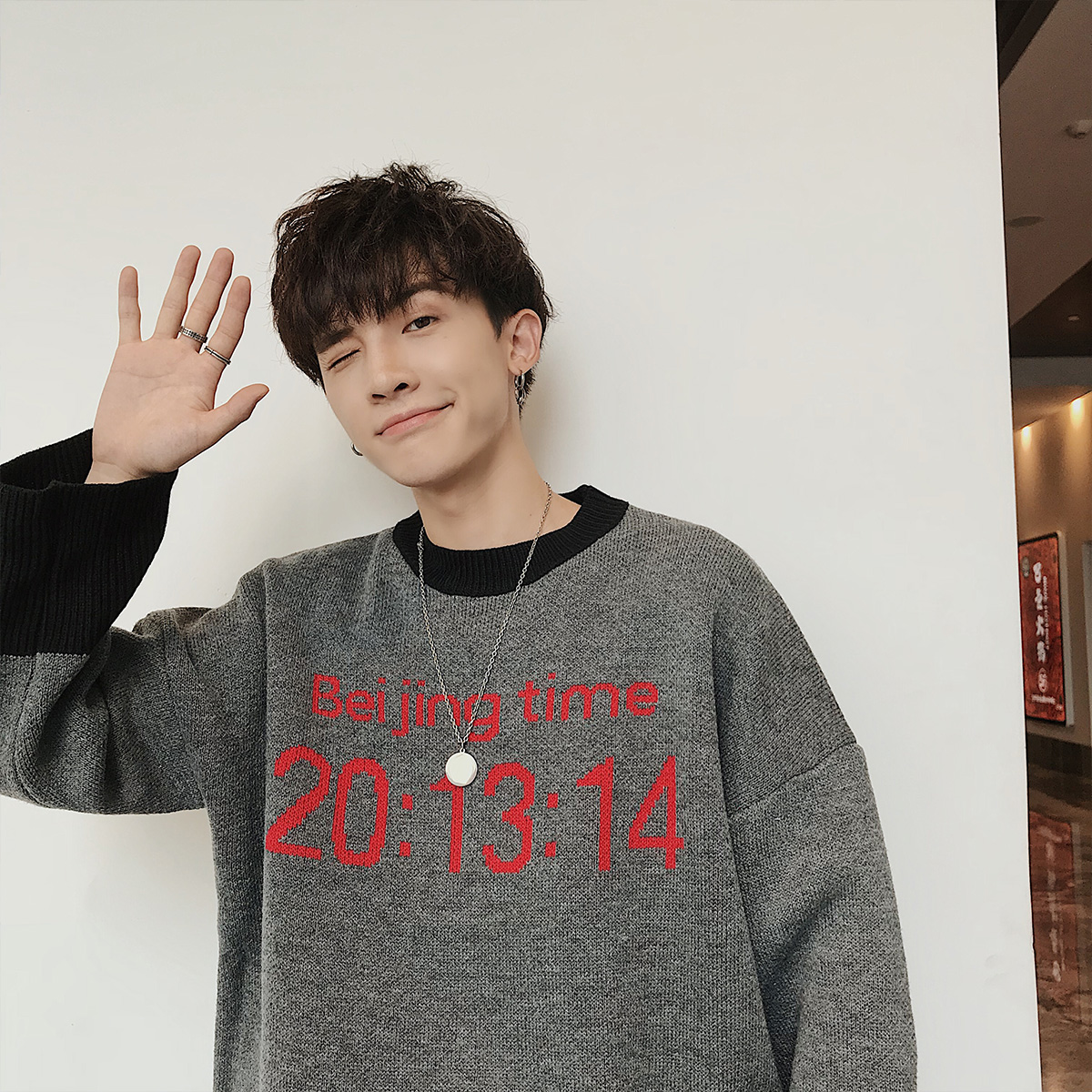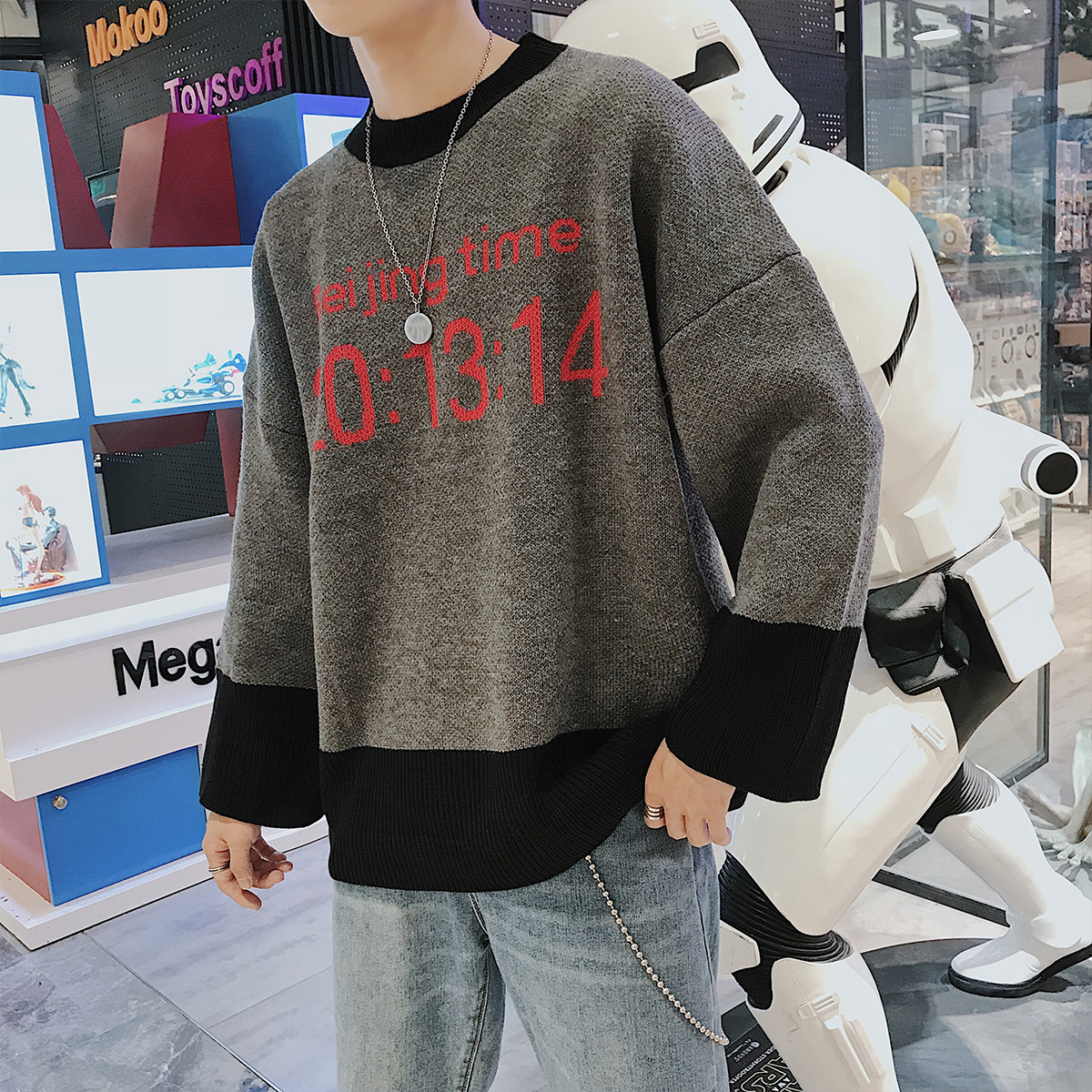文藝男女店男士毛衣秋冬季加厚針織衫韓版潮流印花毛衫外套男休閑
