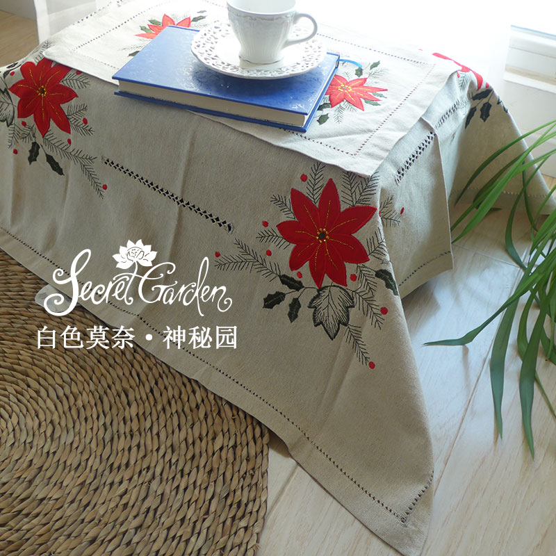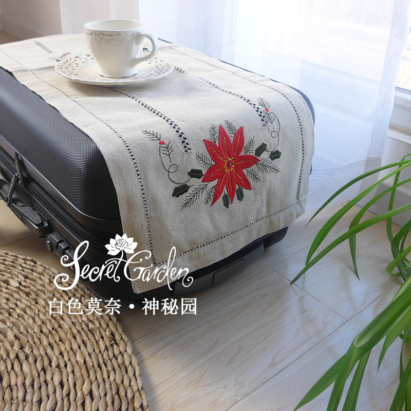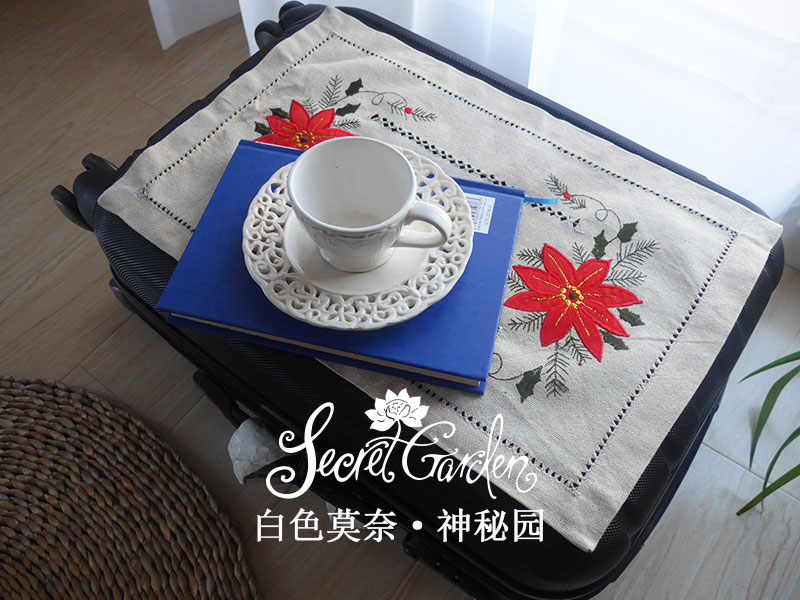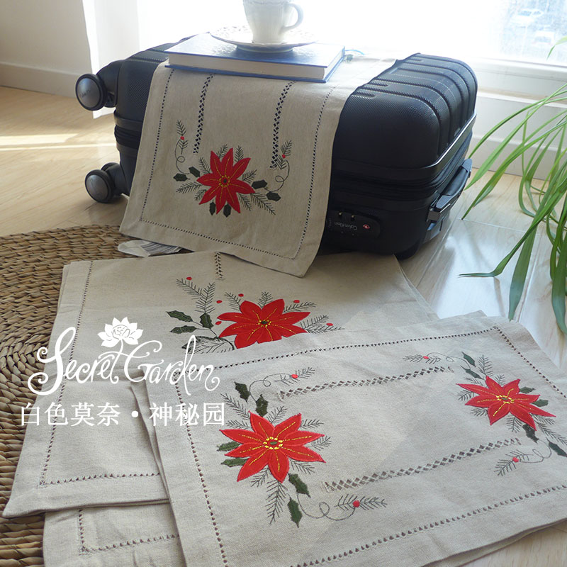 [神秘園]出口美國圣誕紅花貼布繡加手工抽絲桌布桌旗餐墊