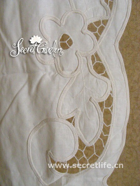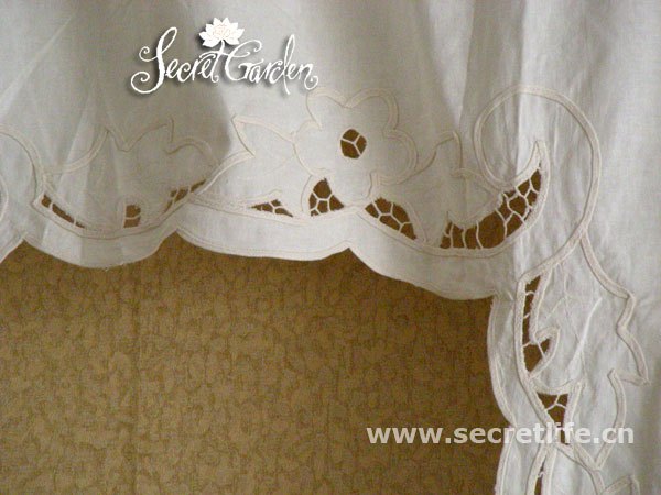 關于她:經典鄉村風……為窗更換新顏,多種美妙用途有待智慧愛美的你來慢慢開發,出口原單帶洗標,手工盤帶繡花工藝細致,設計可愛,手工蕾絲,每片都會有點小小不同,千萬不要要求它如機器制品一般工整……可搭配同系列本色簾頭,長半簾,短半簾,等等,不同款之間可能出現非常輕微的色差~