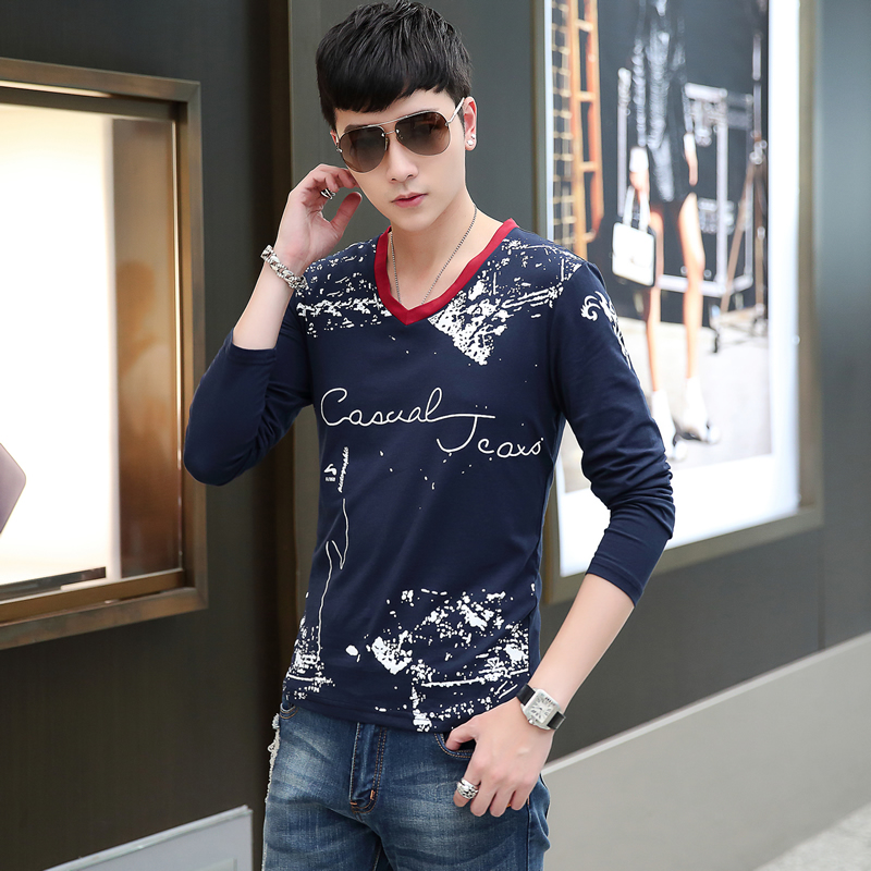 2017新款長袖t恤V領秋季修身打底衫青少年韓版潮男裝大碼男
