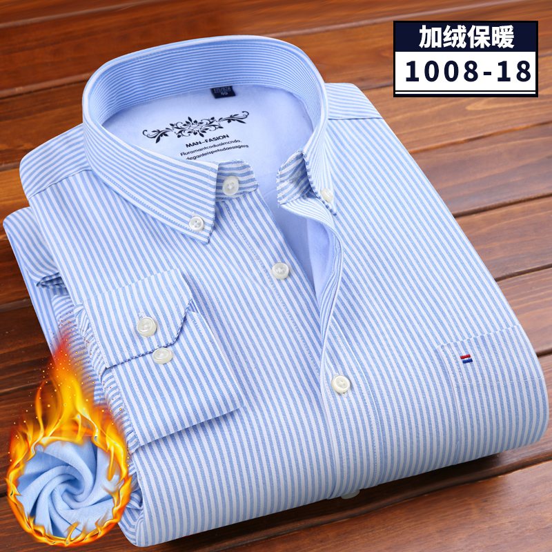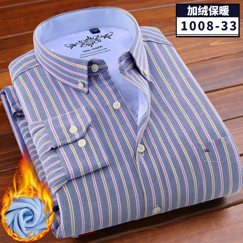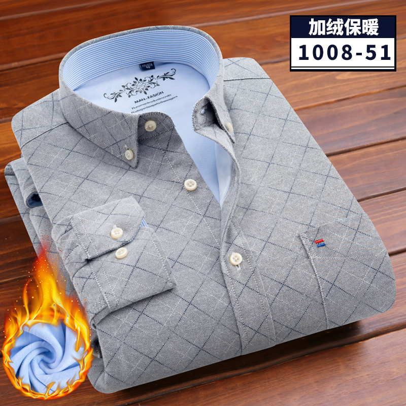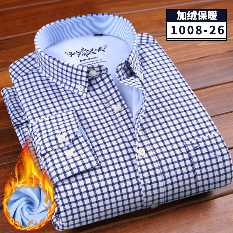 / 冬季牛津紡保暖襯衫男加絨加厚扣領酒紅本命年保暖襯衣休閑爸爸裝