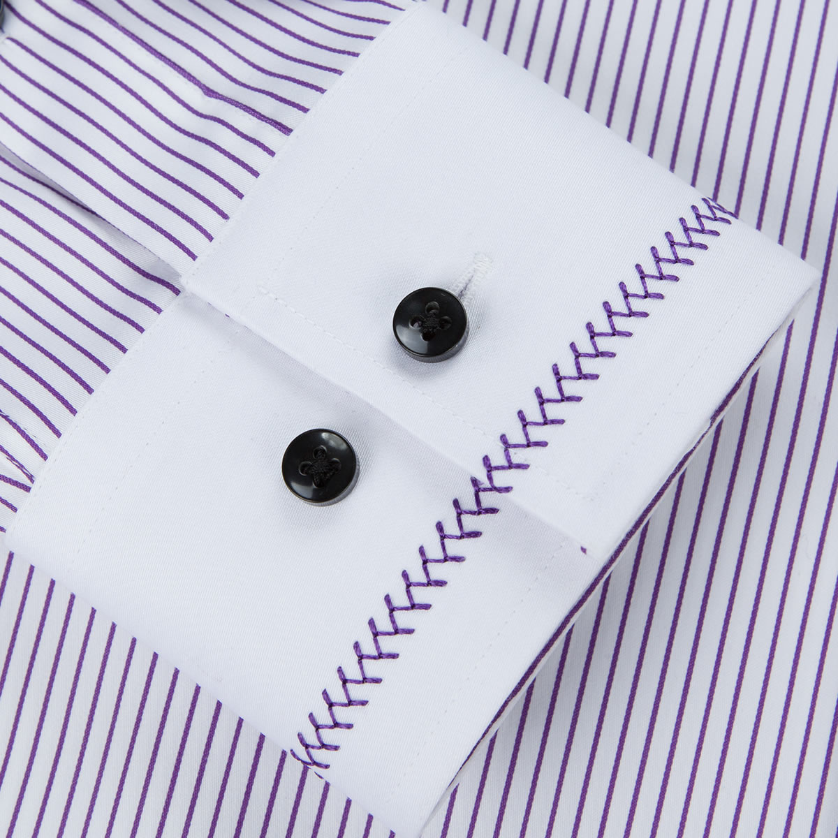 / 深海男士長袖免燙粉紅色條紋絲光棉襯衫 拼接鑲邊領男裝襯衣秋裝