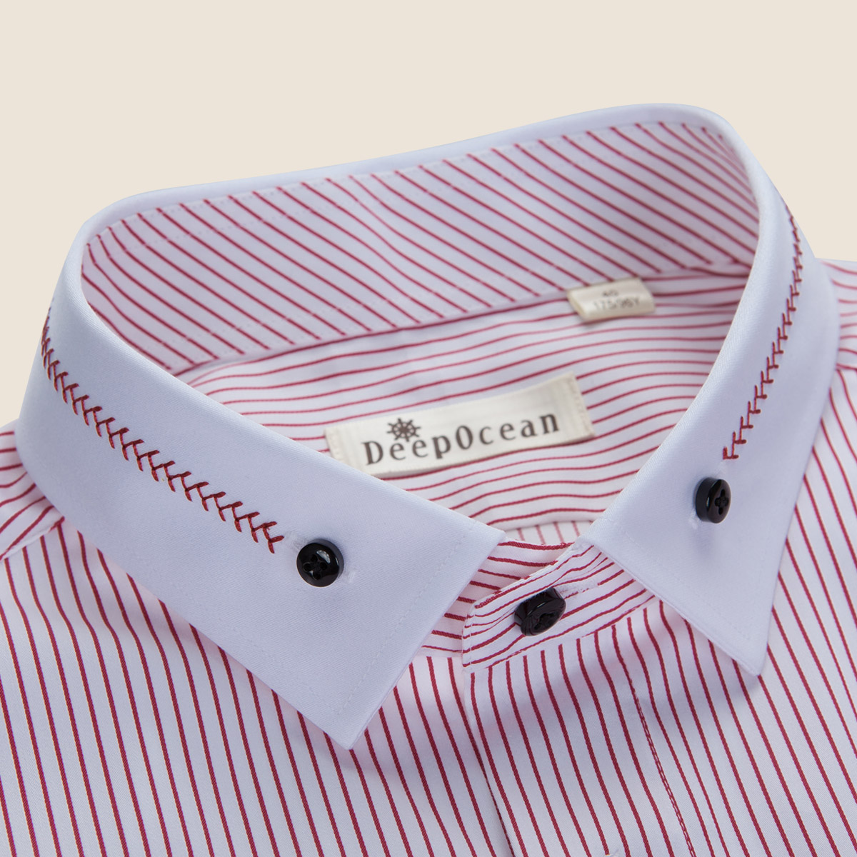 深海男士長袖免燙粉紅色條紋絲光棉襯衫 拼接鑲邊領男裝襯衣秋裝