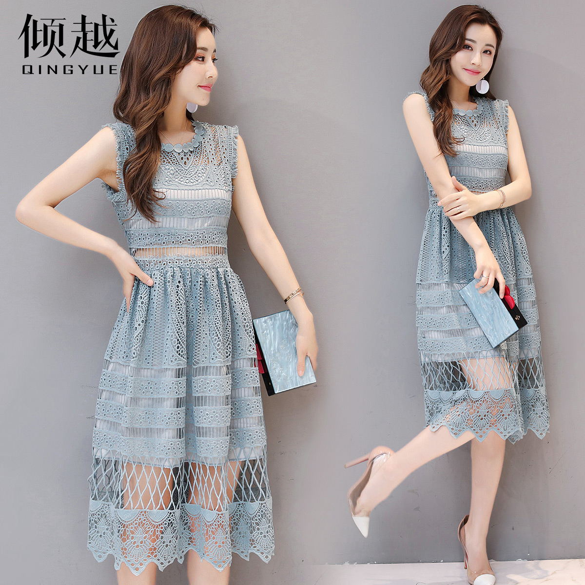 / 中長款連衣裙2017夏季韓版蕾絲繡花圓領百搭修身顯瘦女裝大擺裙潮