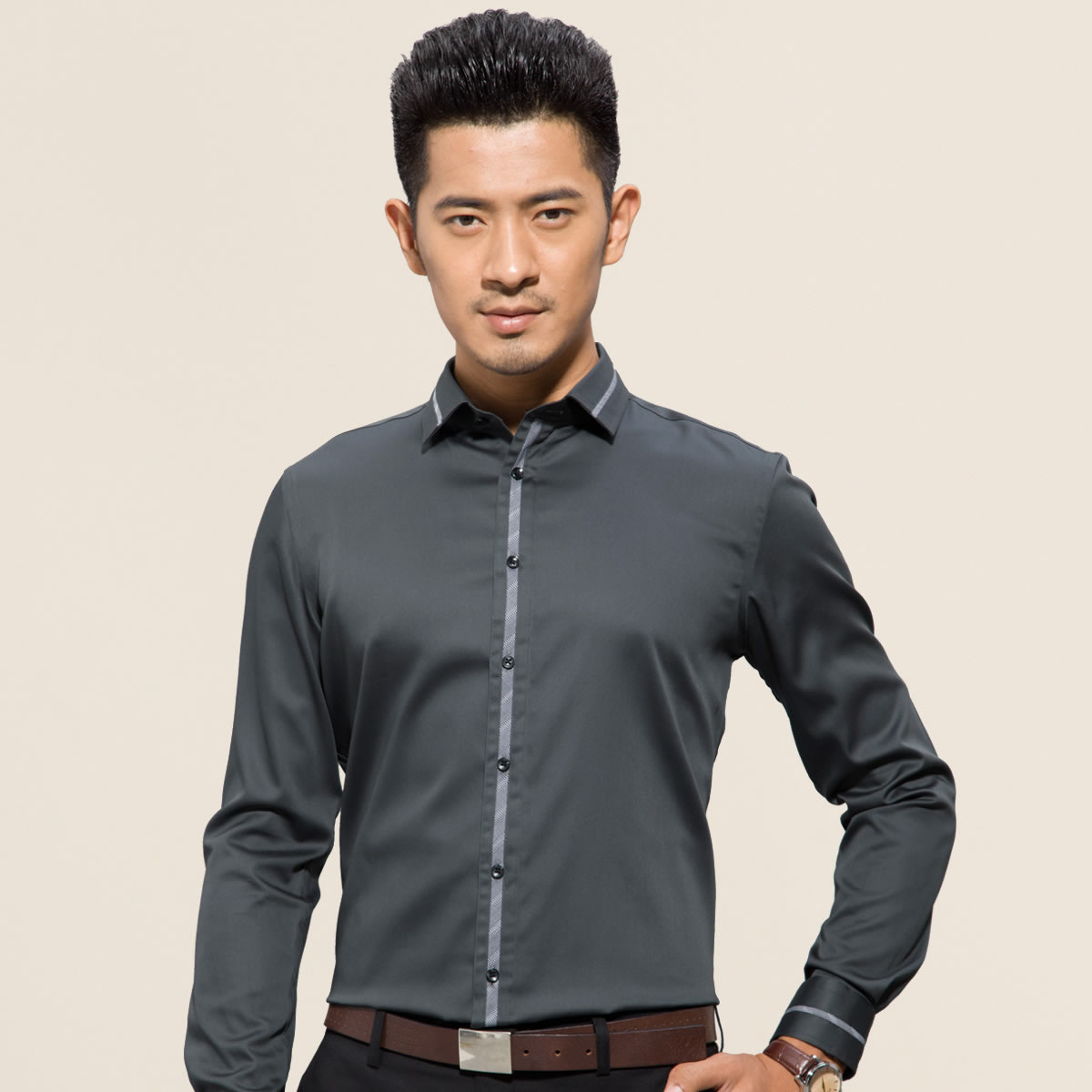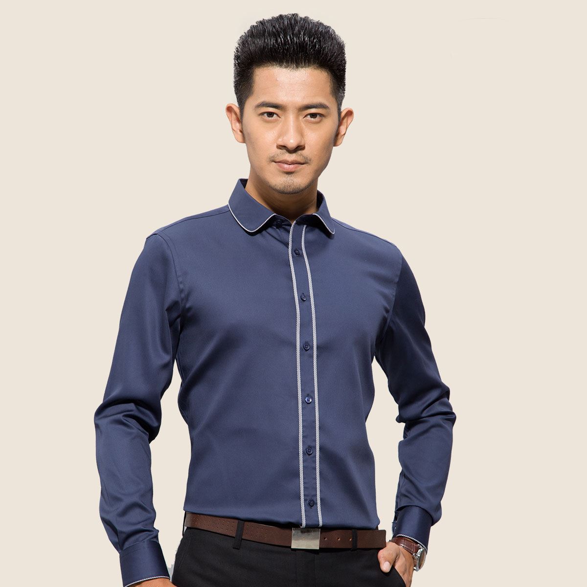 深海紫色襯衫男長袖純色英倫風酒紅色修身型拼接款純棉絲光棉襯衣