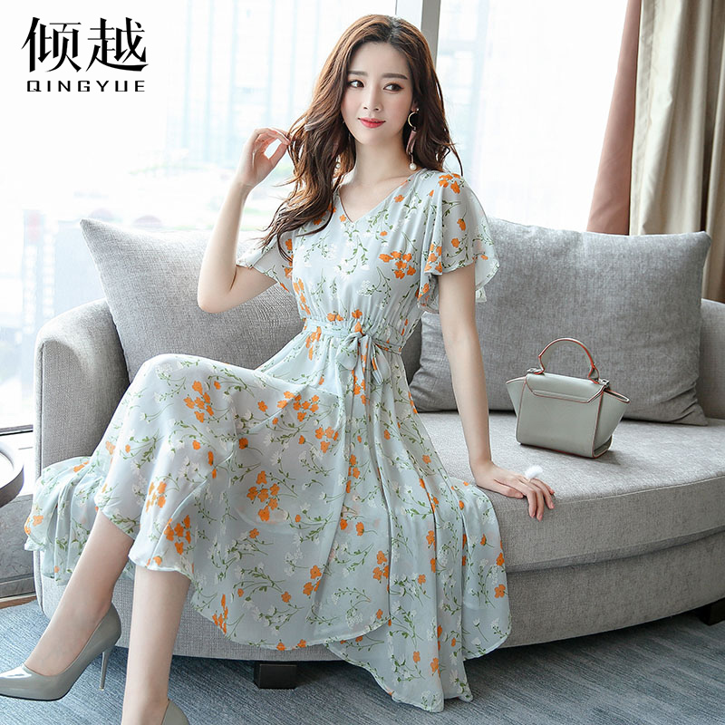 / 2017夏裝新款韓版雪紡碎花收腰顯瘦V領中長款不規則裙擺連衣裙女