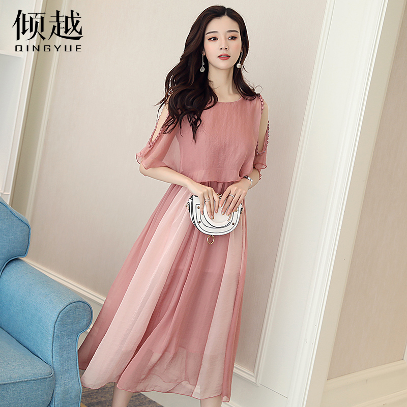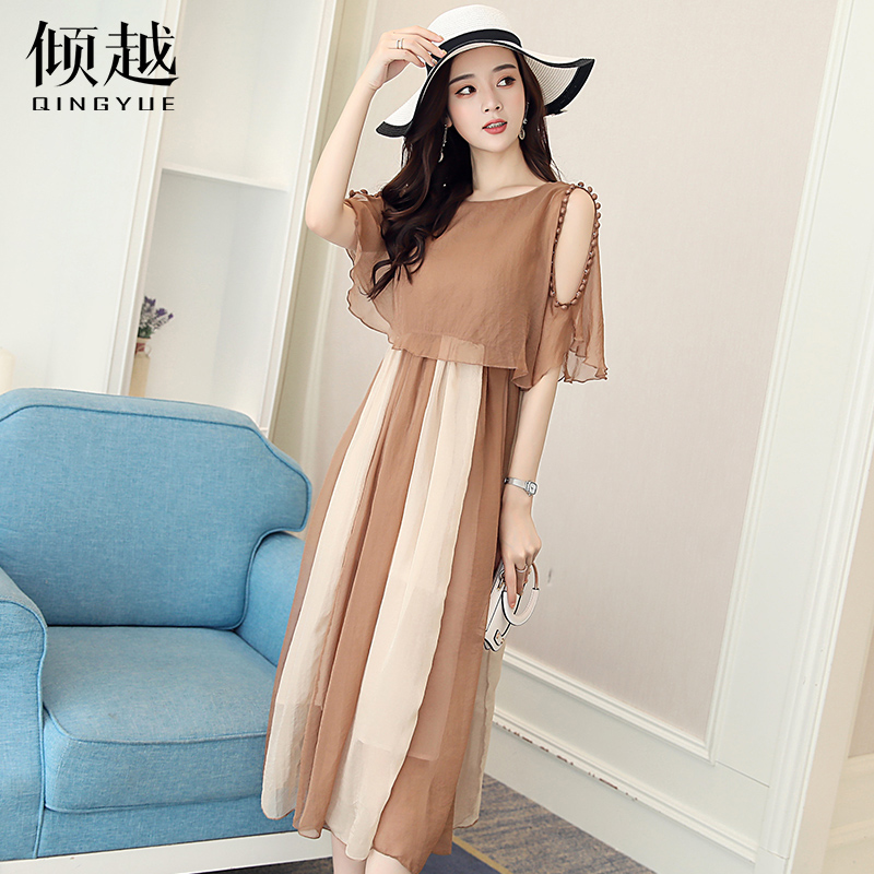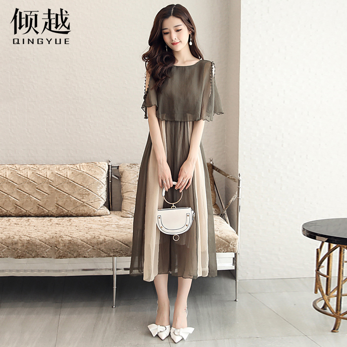 雪紡連衣裙女2017夏季新款韓版時尚喇叭袖修身顯瘦氣質收腰中長裙