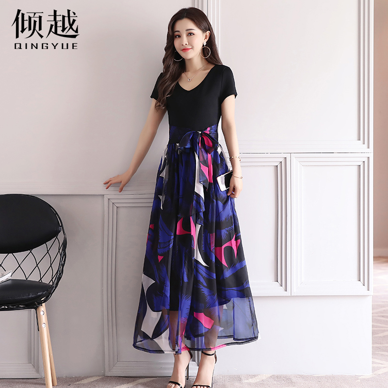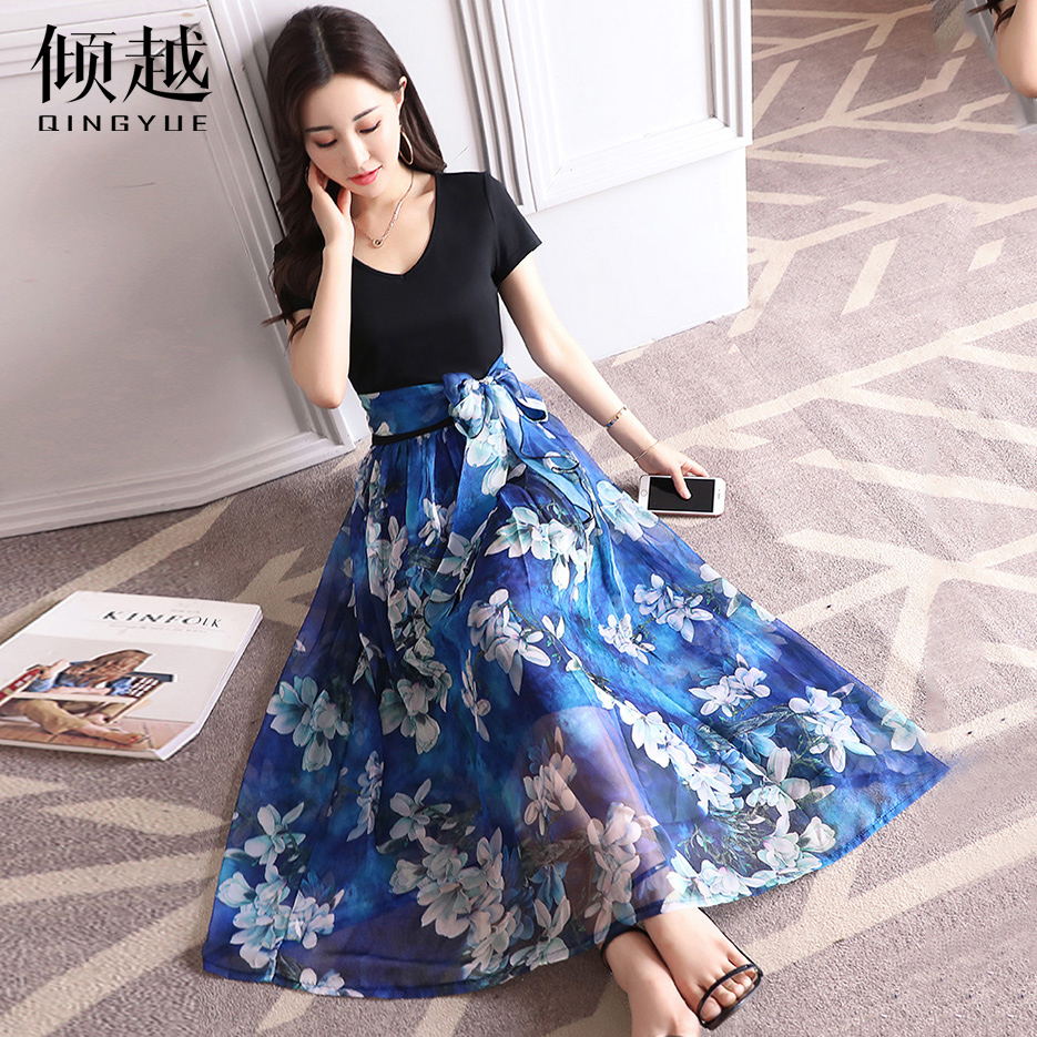 / 2017沙灘裙波西米亞長裙夏新款韓版時尚氣質短袖碎花雪紡連衣裙女