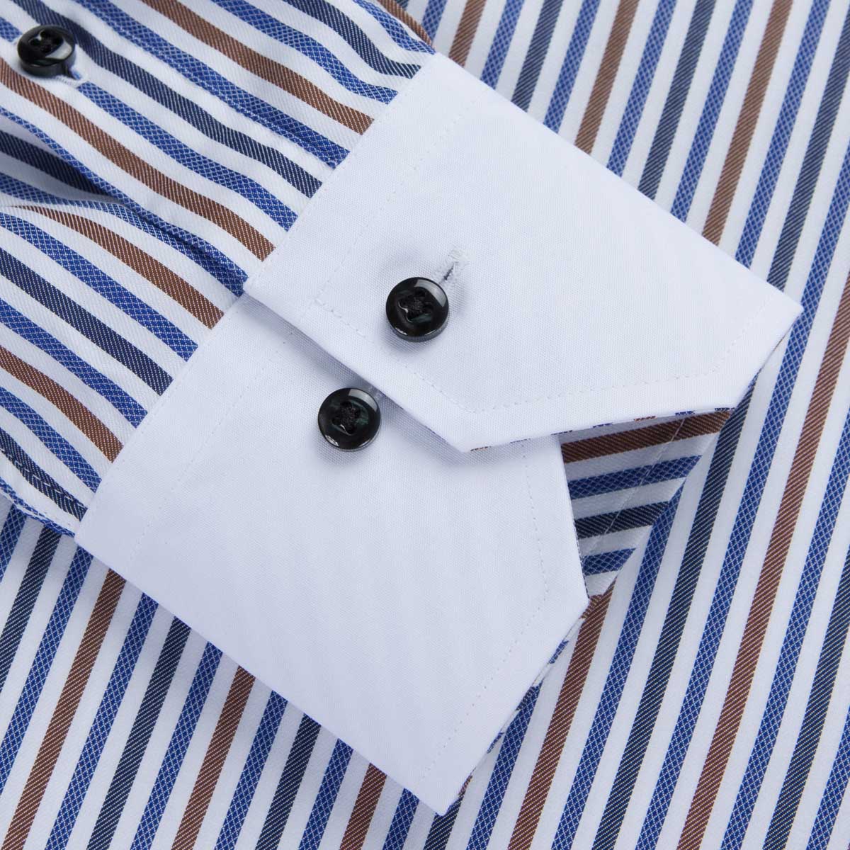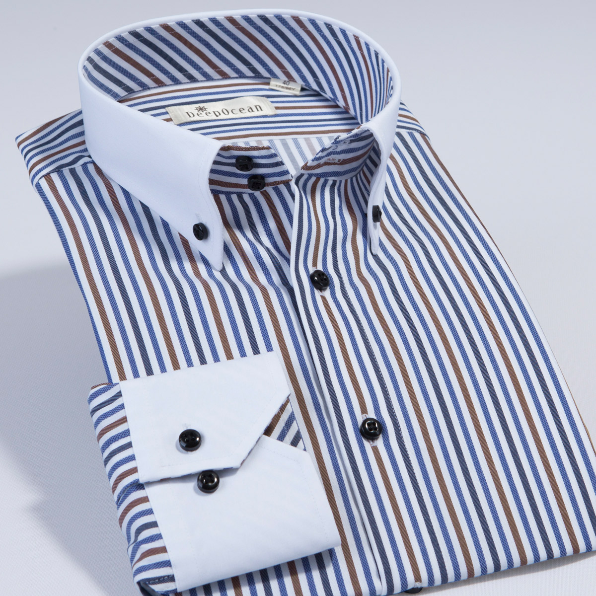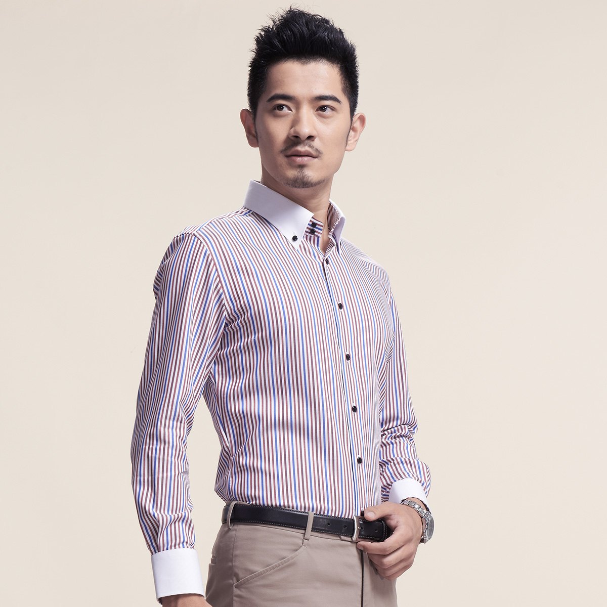 / 男士釘扣領豎條紋襯衫時尚都市襯衫襯衣男長袖韓版修身潮男裝