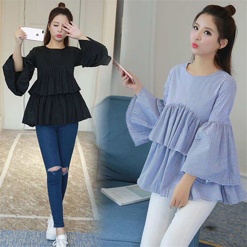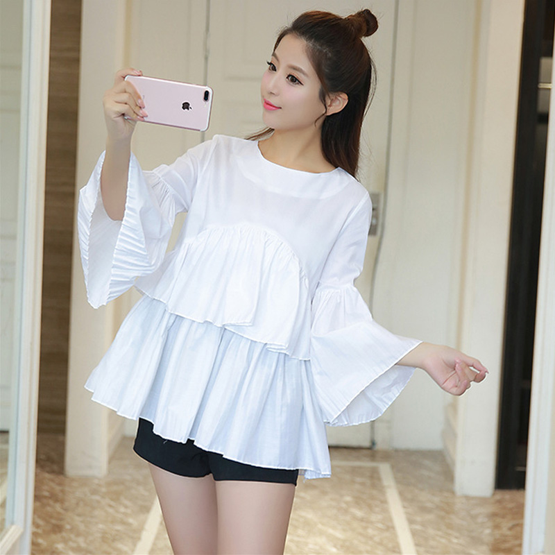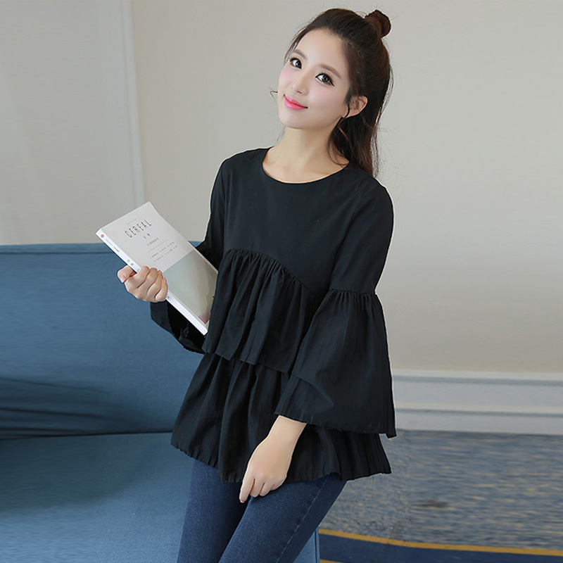 / 春裝新款韓版寬松喇叭袖壓褶襯衣女純色百搭顯瘦娃娃款上衣潮