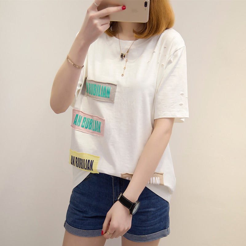夏裝新款女裝寬松體恤衫打底貼布白色t恤女短袖韓版上衣女夏