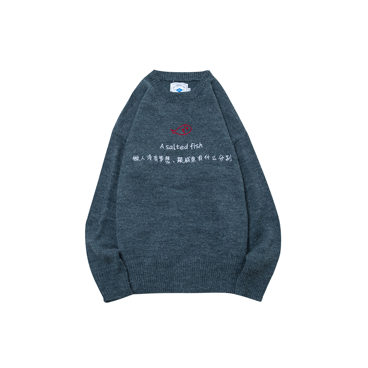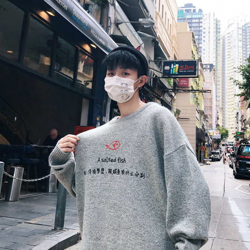 圓領外套衣服潮流男士復古印花寬松針織半高領毛衣原宿風男裝冬季