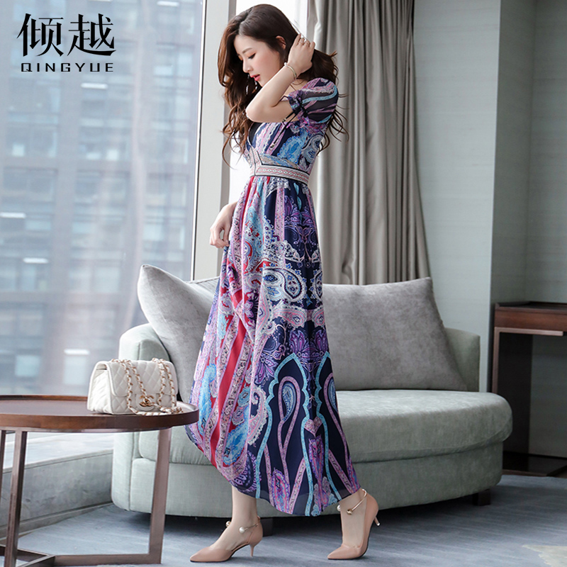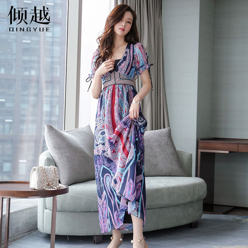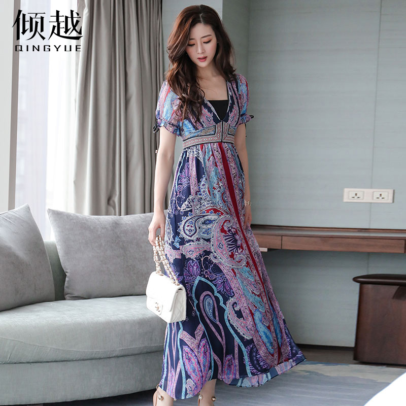 2017夏季印花雪紡連衣裙女波西米亞民族風長裙v領沙灘裙海邊度假