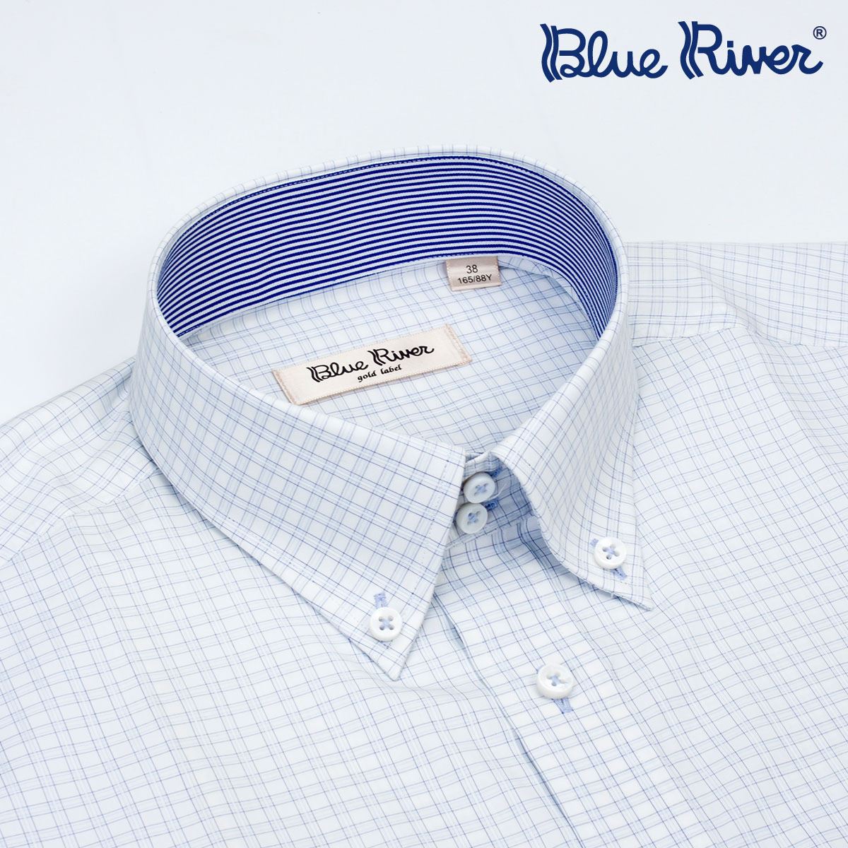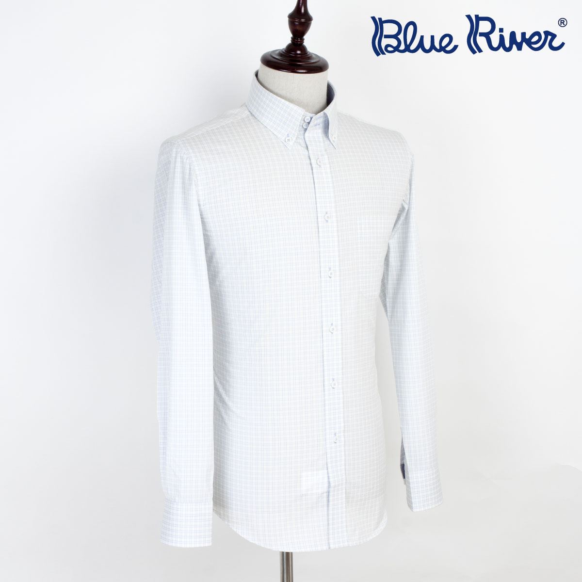 / 藍河新款 淺藍色細條紋方格子商務釘扣領長袖襯衫男士高支棉襯衣