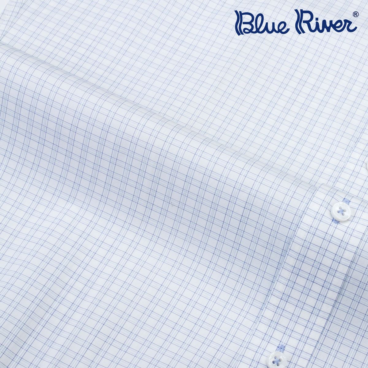 藍河新款 淺藍色細條紋方格子商務釘扣領長袖襯衫男士高支棉襯衣
