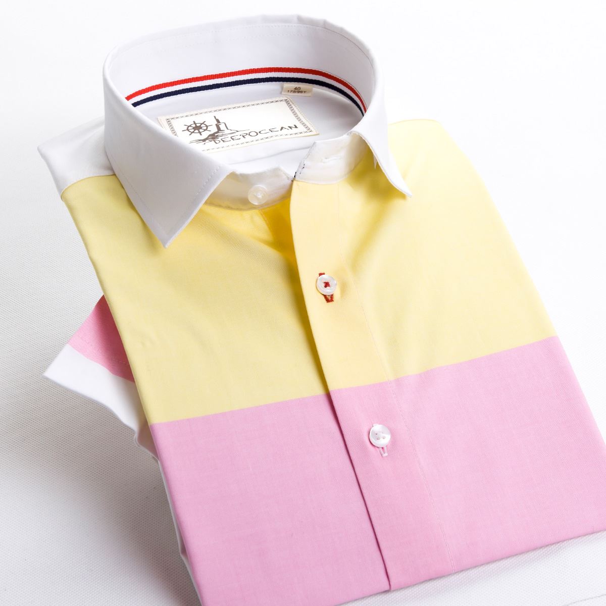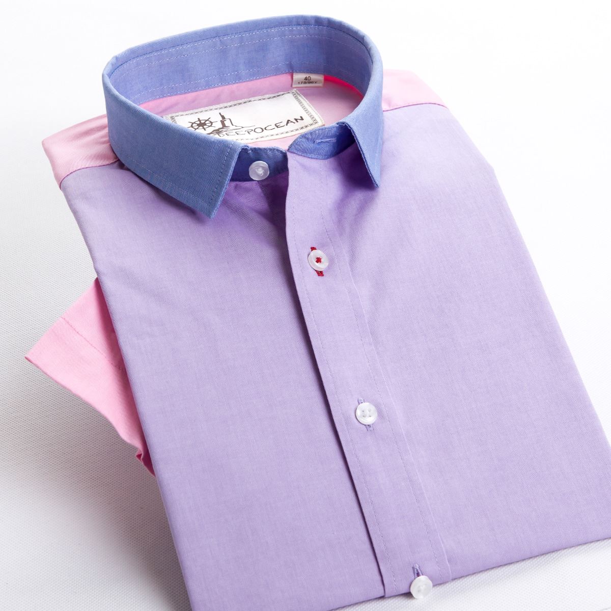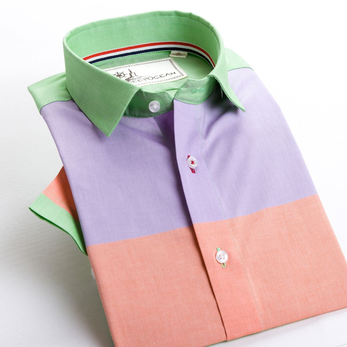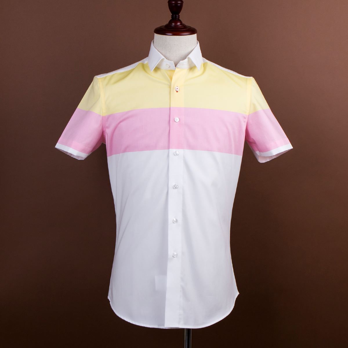 / 夏季新款半袖襯衫糖果色拼接小領時尚純棉牛津紡修身短袖襯衣