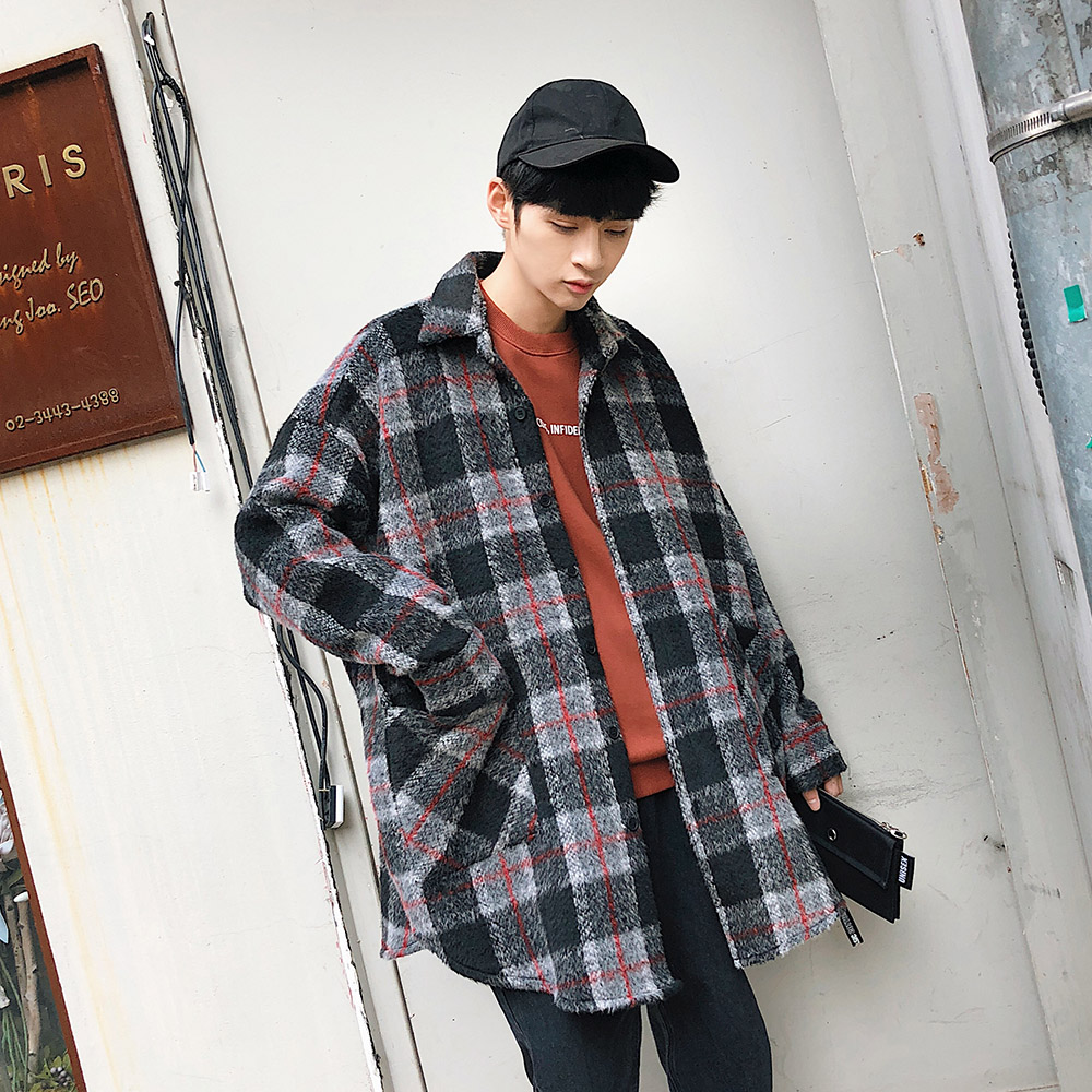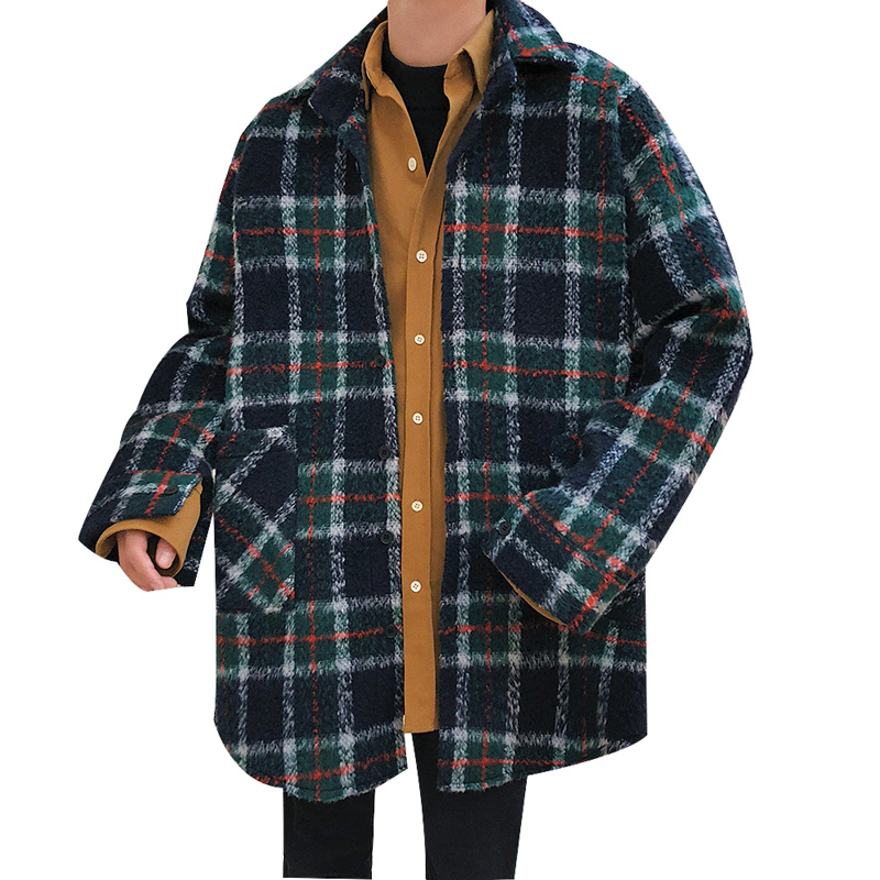 新款中長款男士毛呢大衣秋季韓版潮外套男格子大衣男潮流百搭外衣