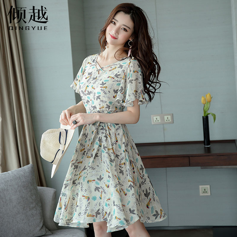 / 中腰荷葉袖2017夏季新款氣質短袖X型褶皺中長款時尚碎花連衣裙潮