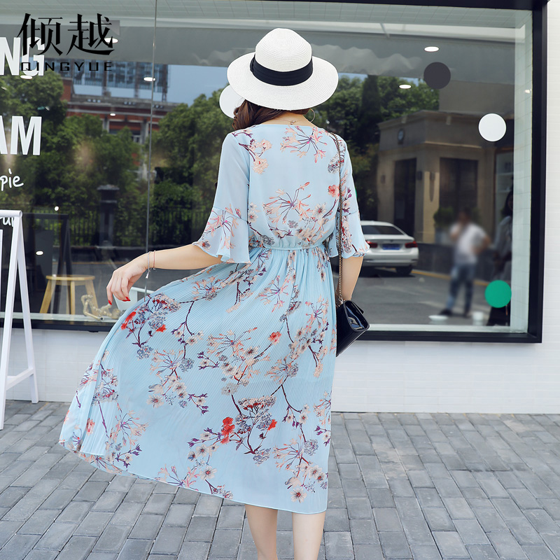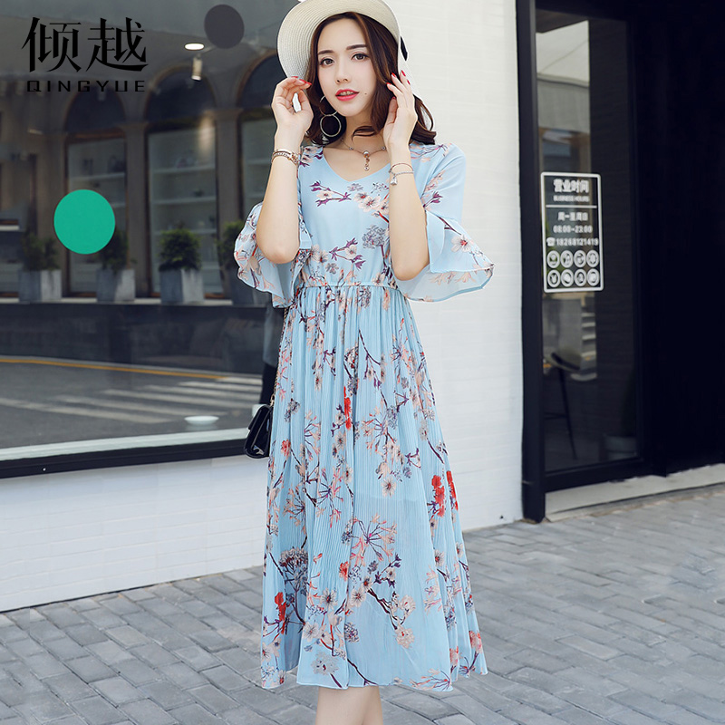 / 2017夏季新款女裝韓版氣質V領喇叭袖雪紡裙大擺碎花長裙連衣裙女