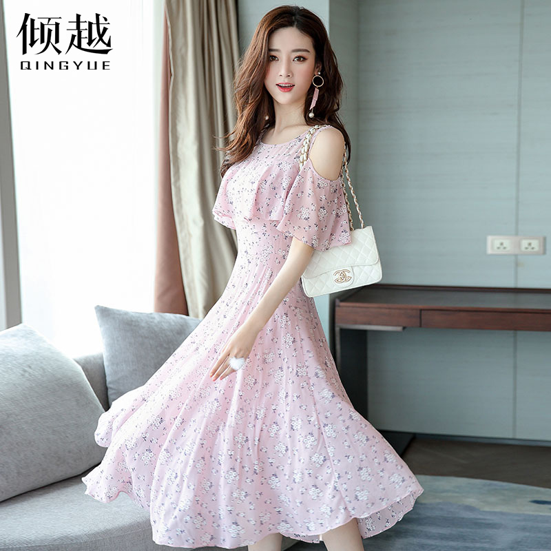 2017新款版女裝短袖荷葉邊印花漏肩雪紡長裙中腰圓領中長款連衣裙