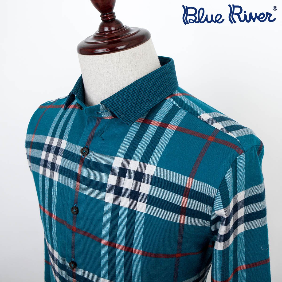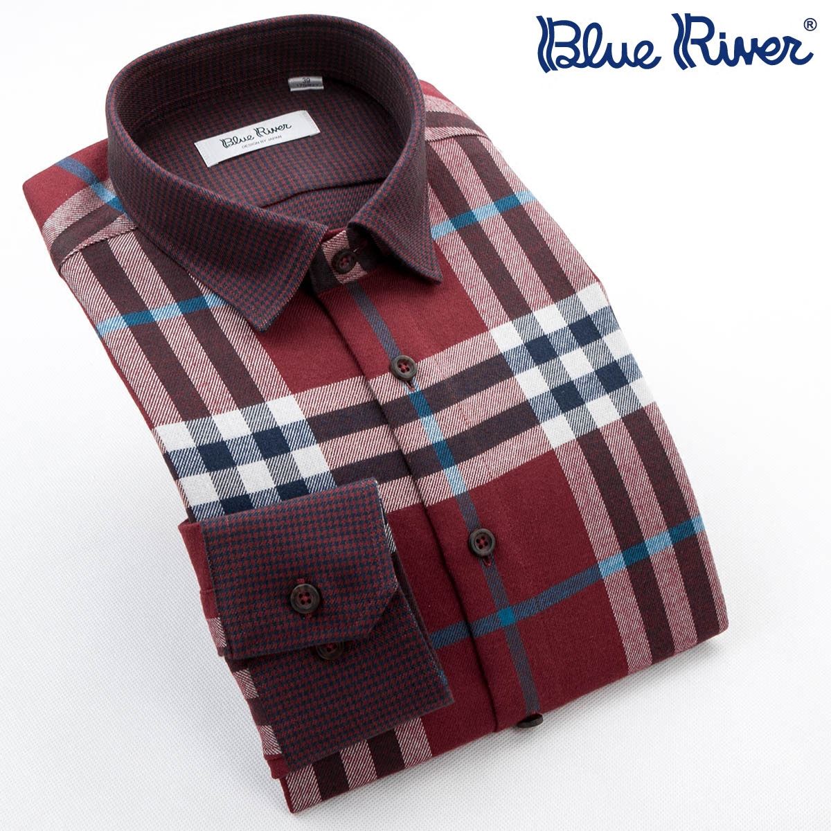 藍格子襯衫男長袖棉質保暖天絲秋季紅格紋襯衣藍河2018新品男裝