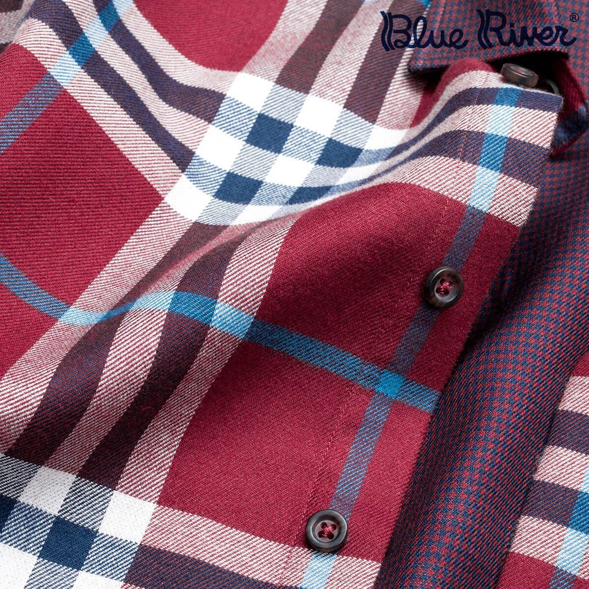 / 藍格子襯衫男長袖棉質保暖天絲秋季紅格紋襯衣藍河2018新品男裝