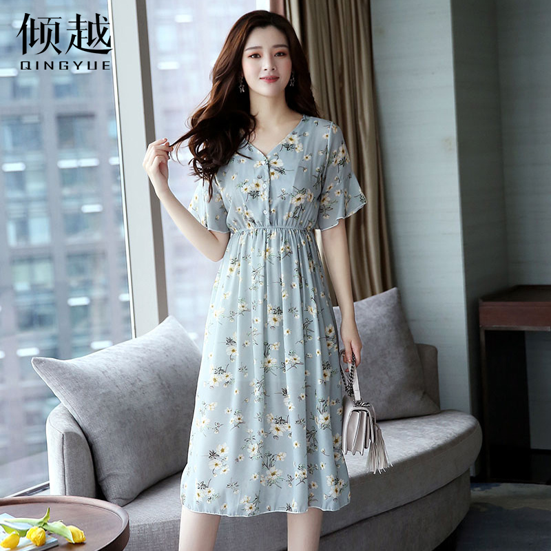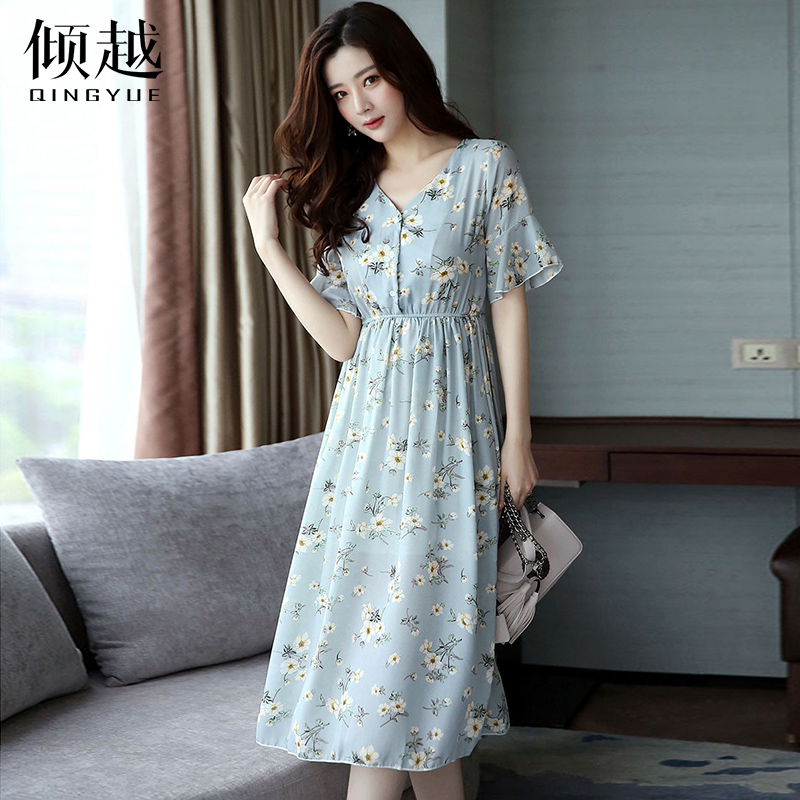 / 2017夏季新款韓版女裝小清新雪紡連衣裙子中長款碎花顯瘦短袖收腰