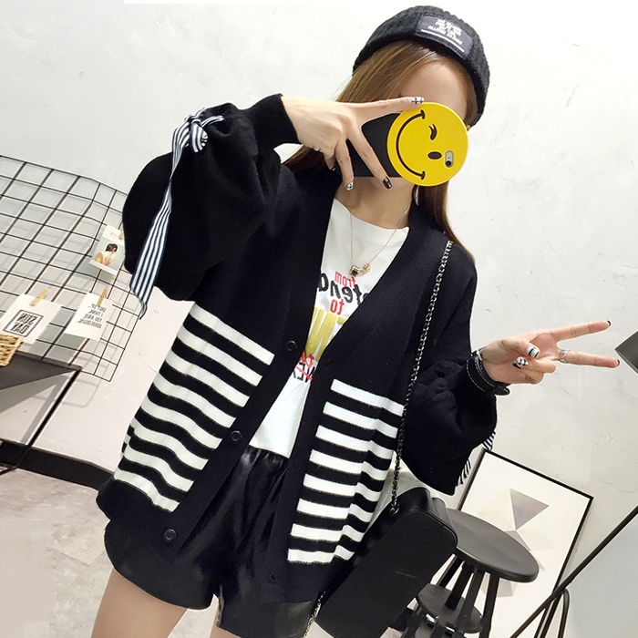 / 秋裝新款韓版時尚系帶條紋開衫針織衫女裝寬松薄款毛衣長袖外套潮
