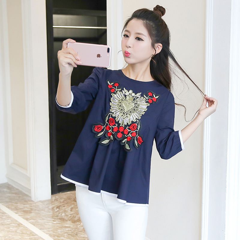/ 新款春季民族風刺繡娃娃衫寬松大碼七分袖短款襯衫女A字上衣