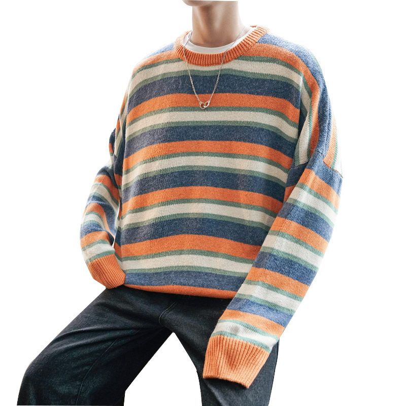 文藝男女店潮流寬松男士秋季圓領毛衣新款韓版條紋針織衫男裝線衣