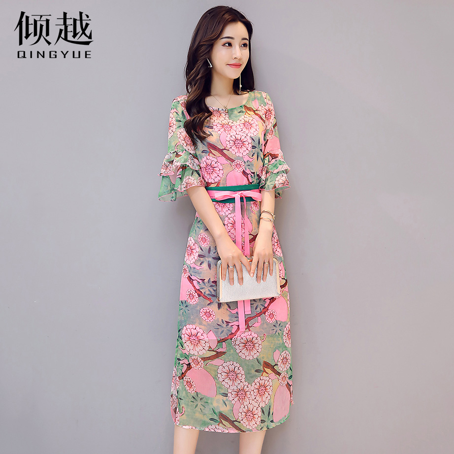 / 2017夏季新款復古印花短袖雪紡連衣裙時尚簡約氣質顯瘦開叉長裙子