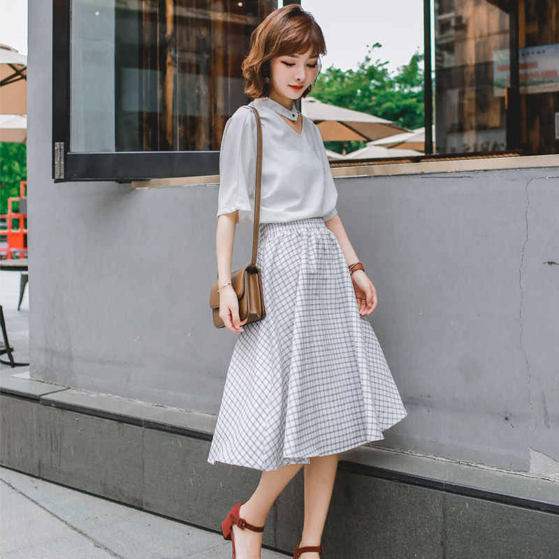 / 夏季新款格子百褶裙中長款女學生高腰百搭韓版a字半身長裙子