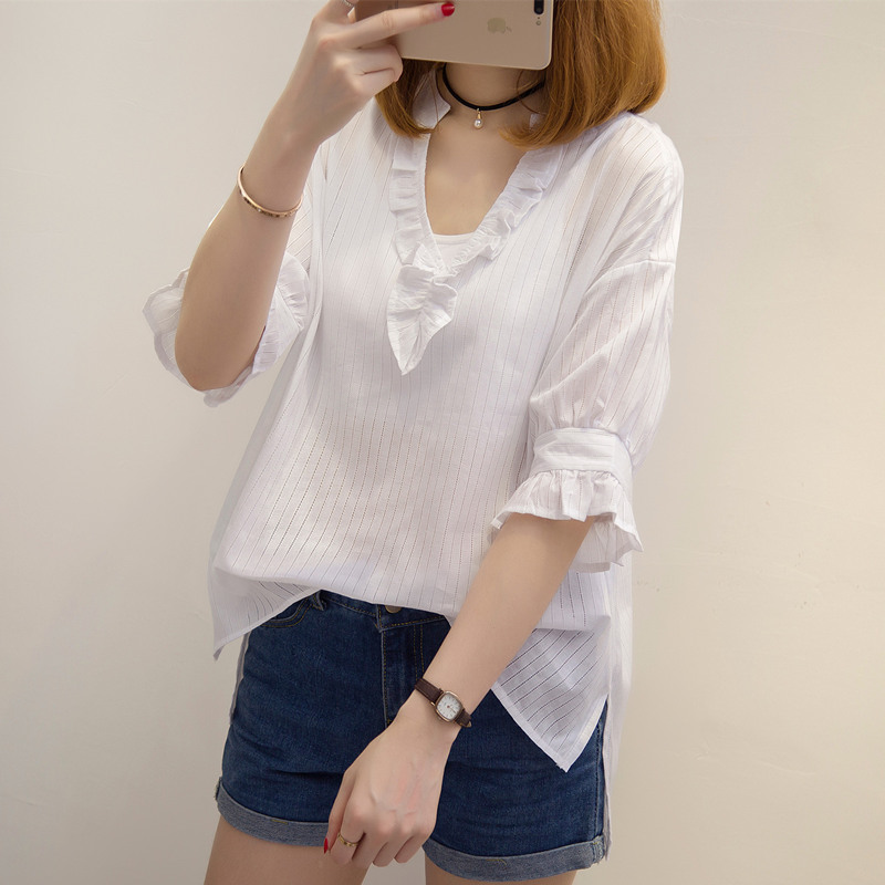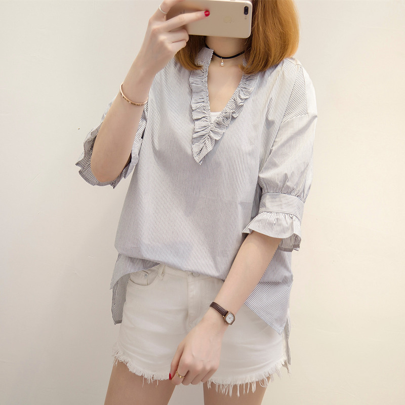 夏裝新款女裝寬松半袖條紋襯衫女甜美上衣小清新韓范bf風襯衣