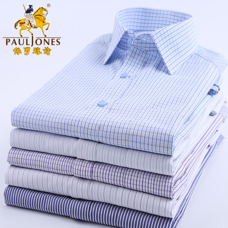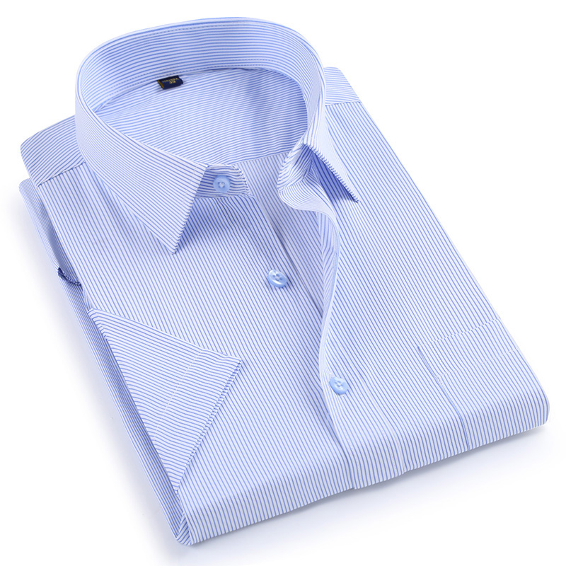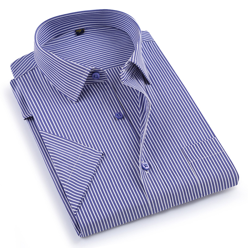 / 夏季小藍格子短袖襯衫男士商務休閑工裝半袖襯衣白底藍條免燙寸衫